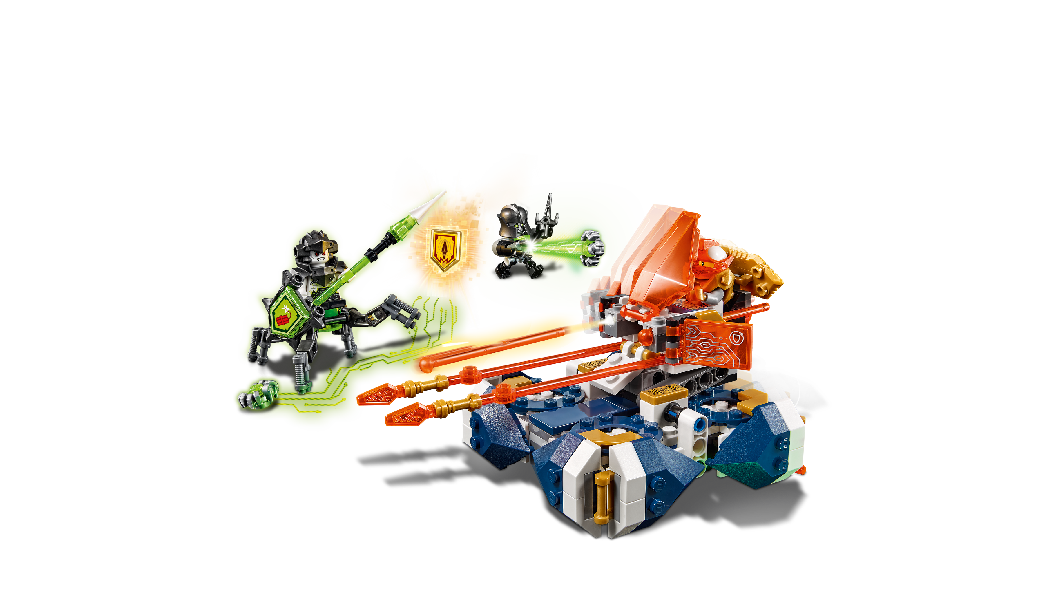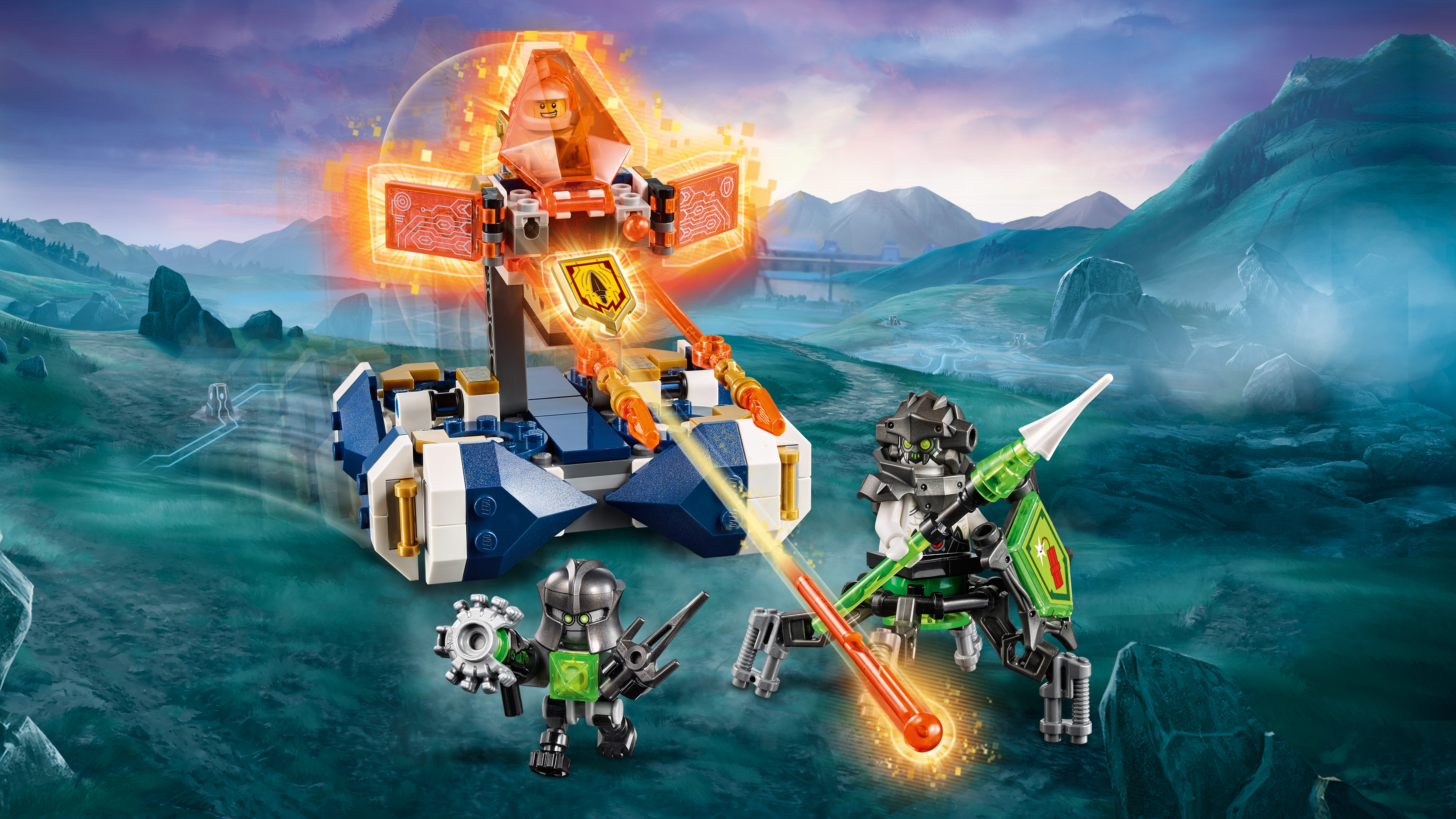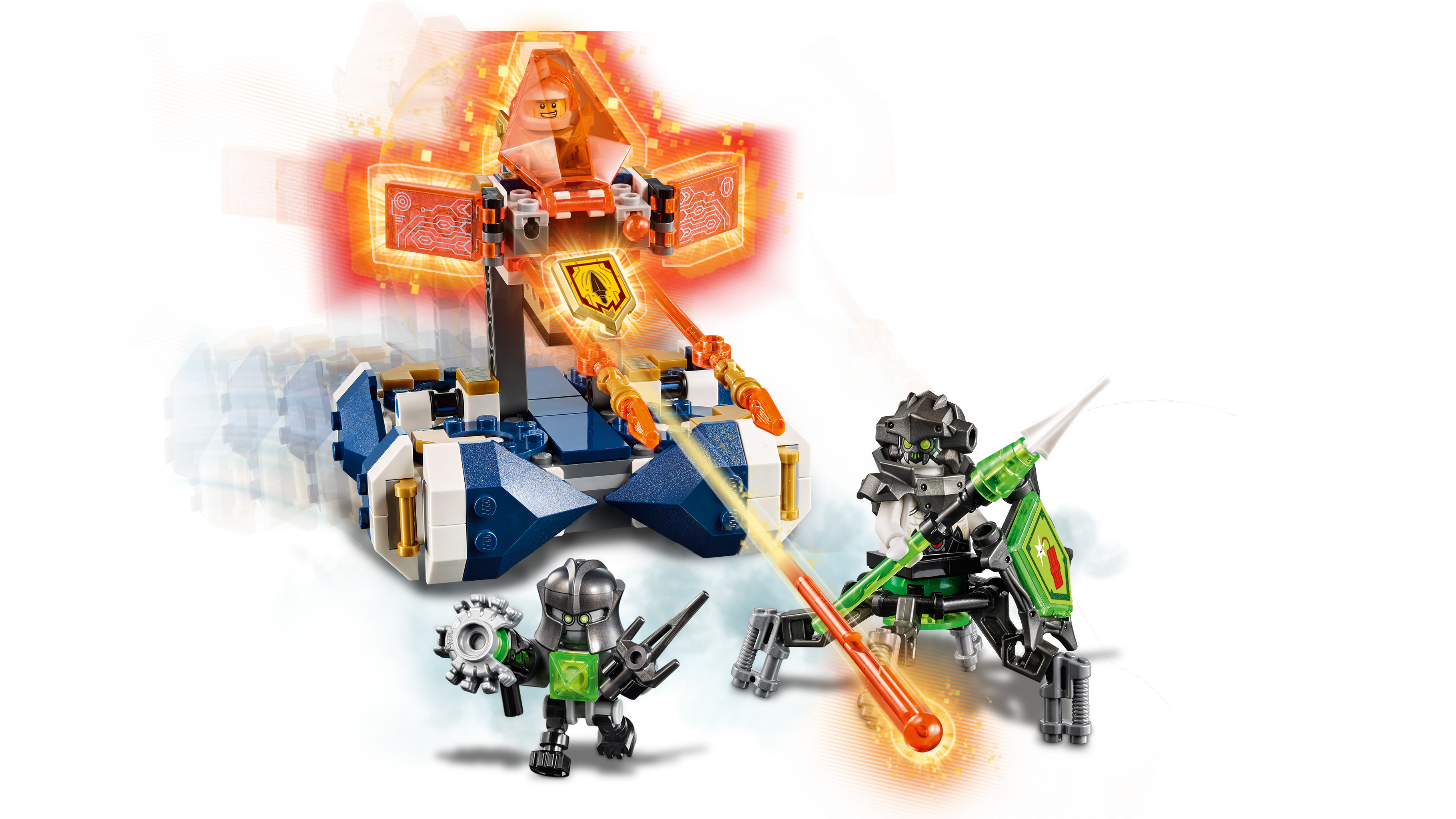 Przygotuj się do pojedynku z Cezarem i jego złym giermkobotem — Dennisem Cyberbajterem. Powstrzymaj ich w Bojowym poduszkowcu Lance’a, zanim wprowadzą w życie swój plan i zniszczą Knighton infekcją technologiczną Monstroxa. Włącz tryb bojowy i nie pozwól Dennisowi Cyberbajterowi wystrzelić potworka roznoszącego infekcję! W zestawie są trzy tarcze mocy NEXO do zeskanowania: Dynamoc, Diamentowy Oszczep i moc Merloka — Lanca Merloka.