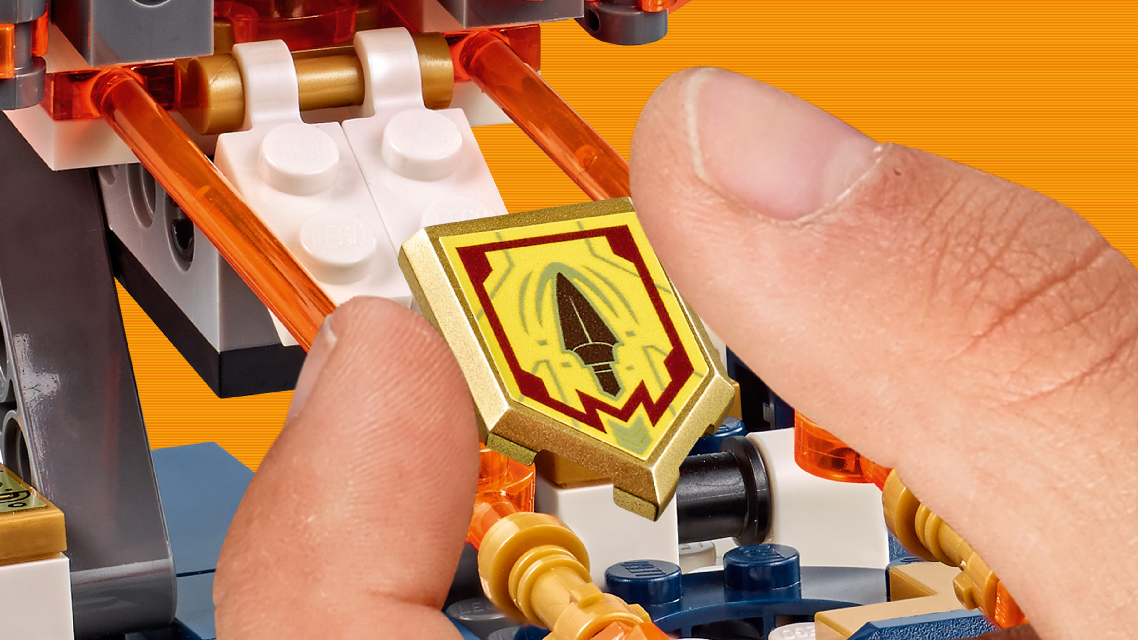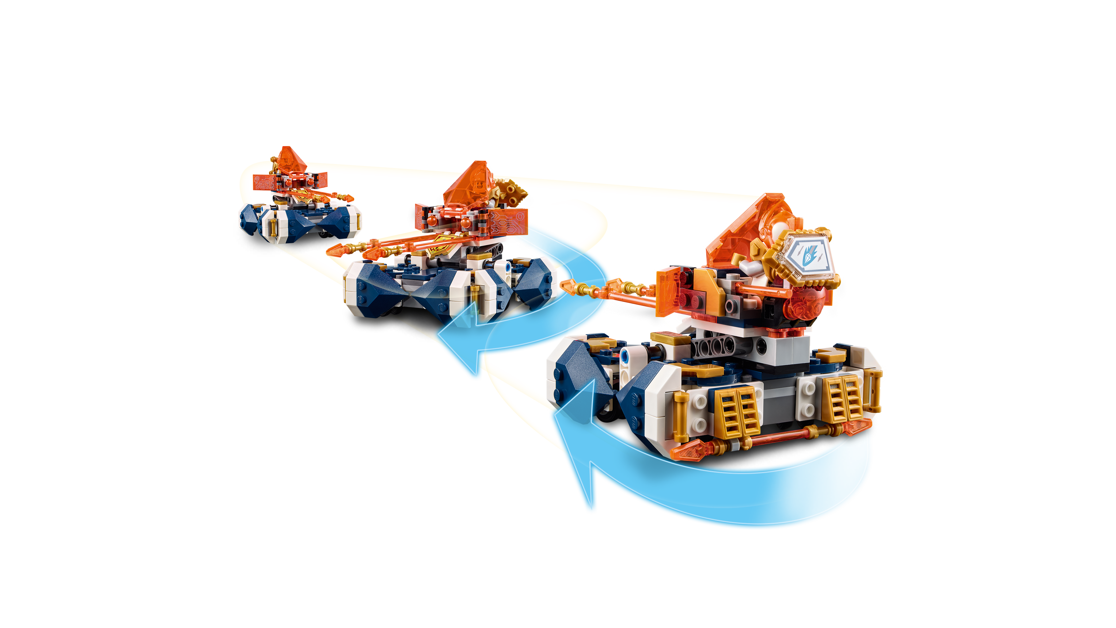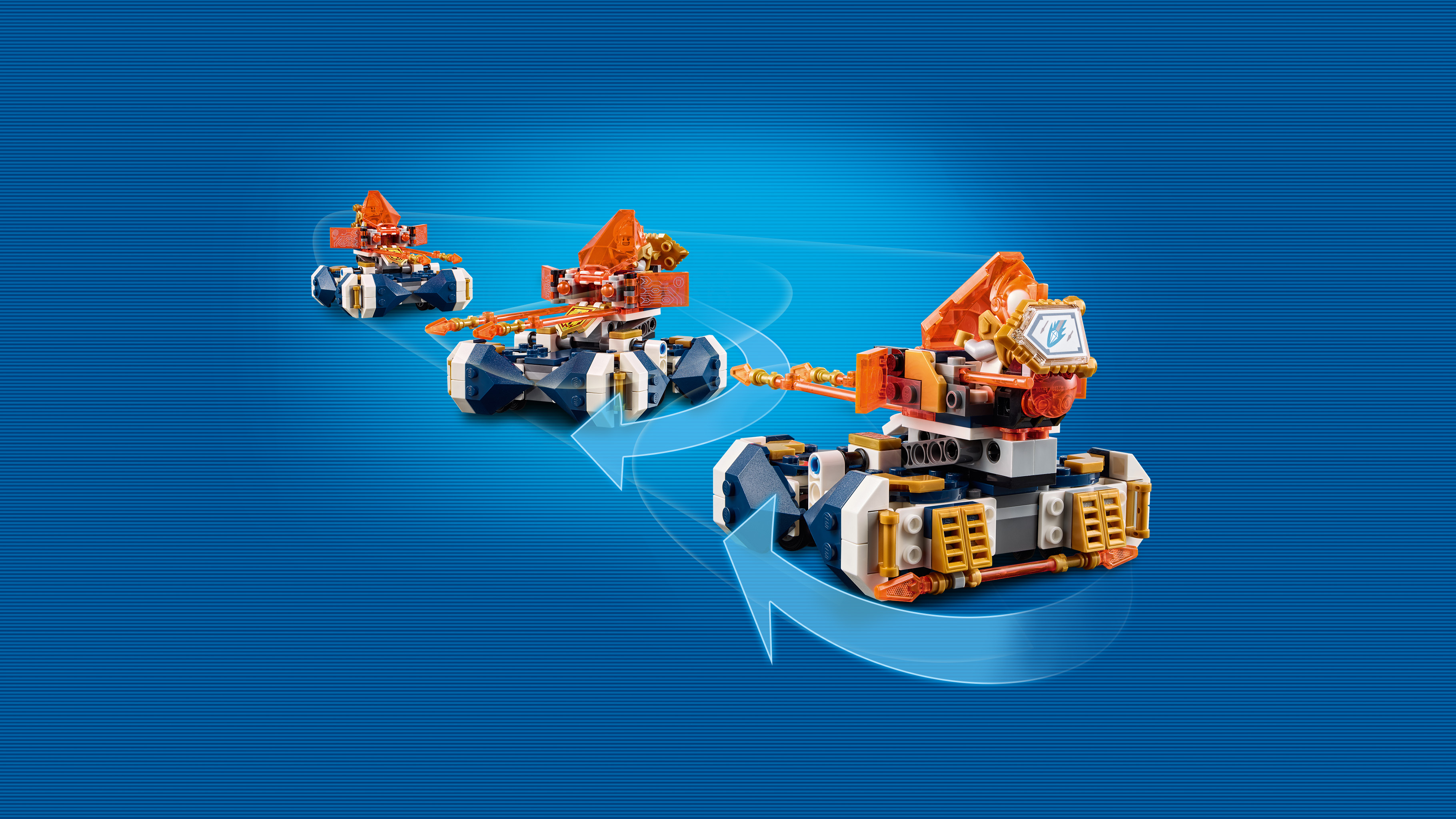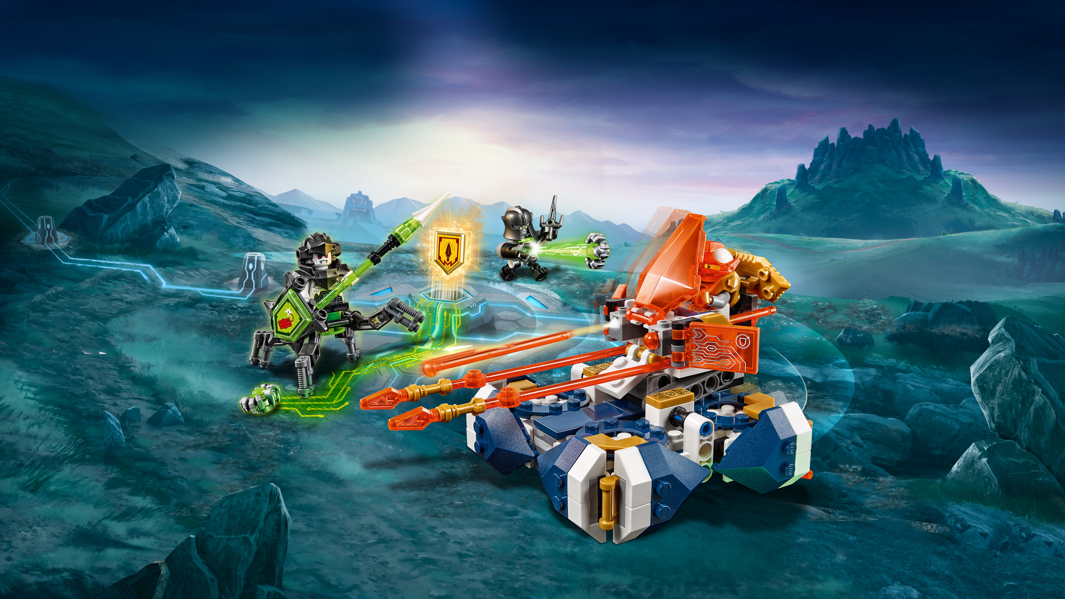 Przygotuj się do pojedynku z Cezarem i jego złym giermkobotem — Dennisem Cyberbajterem. Powstrzymaj ich w Bojowym poduszkowcu Lance’a, zanim wprowadzą w życie swój plan i zniszczą Knighton infekcją technologiczną Monstroxa. Włącz tryb bojowy i nie pozwól Dennisowi Cyberbajterowi wystrzelić potworka roznoszącego infekcję! W zestawie są trzy tarcze mocy NEXO do zeskanowania: Dynamoc, Diamentowy Oszczep i moc Merloka — Lanca Merloka.