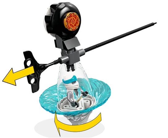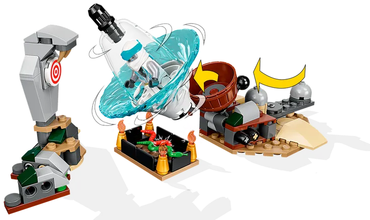 - Przygody z obrotową zabawką — dzieci mogą umieścić ninja w spinnerze, pociągnąć linkę i zobaczyć, jak ninja bierze udział w różnych wyzwaniach, takich jak przeskakiwanie nad dołem z wężami oraz walka z manekinem szkoleniowym