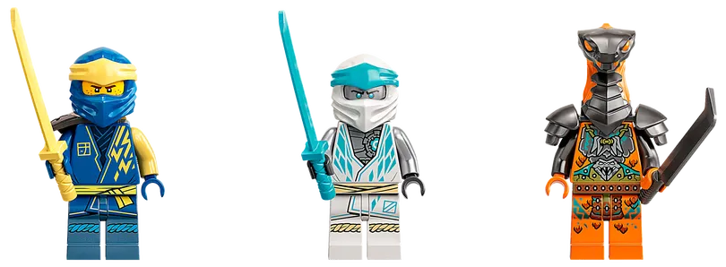- Trzy minifigurki — ta zabawka ninja zawiera minifigurki Zane’a i Jaya z mieczami oraz niszczyciela boa z własnym dużym mieczem. Dzięki minifigurkom dzieci mogą urządzać brawurowe pojedynki