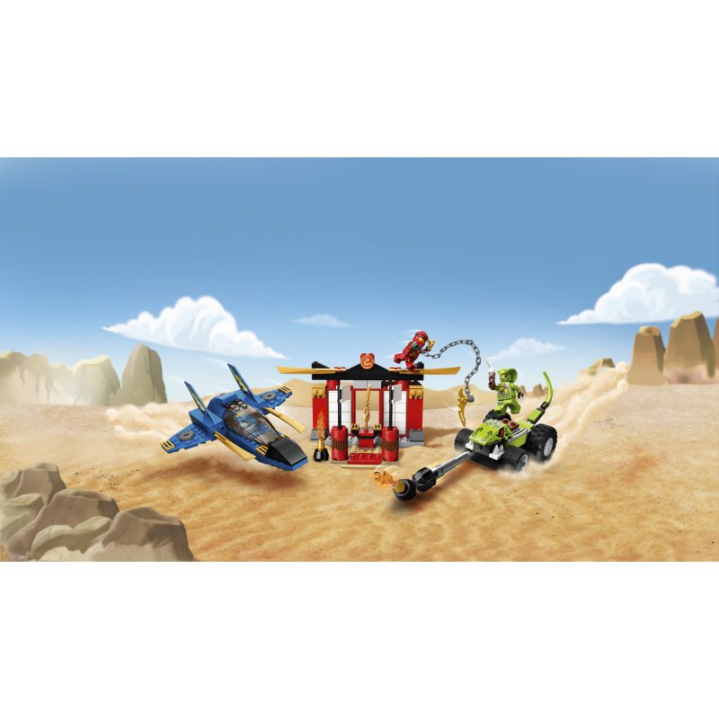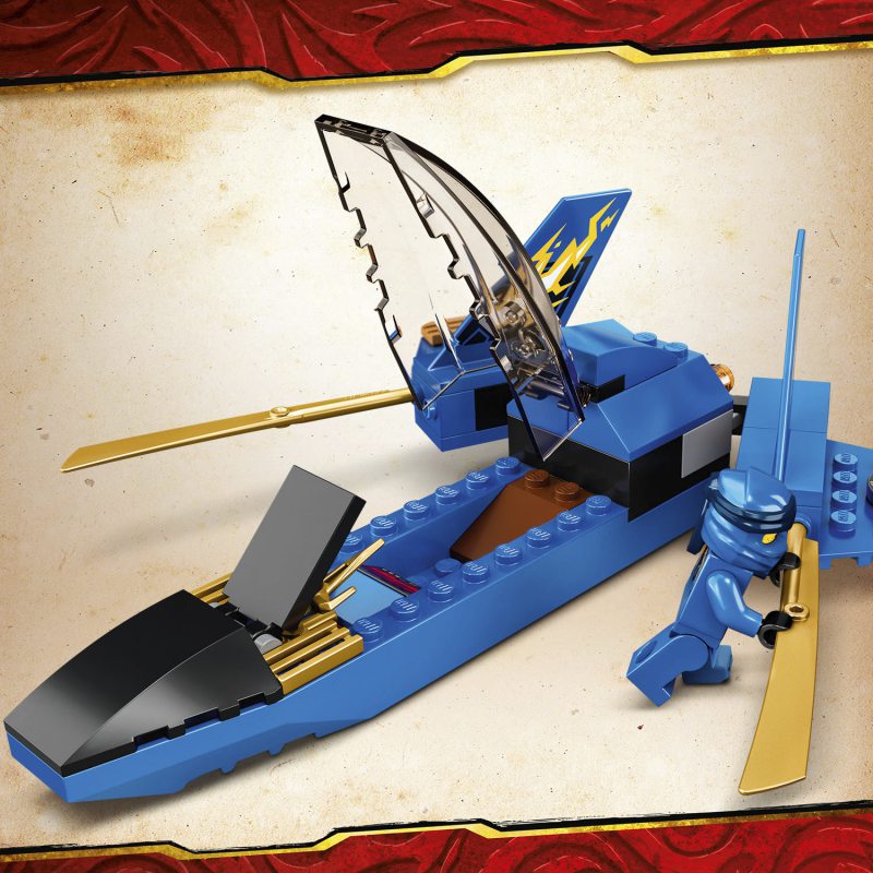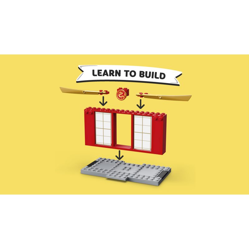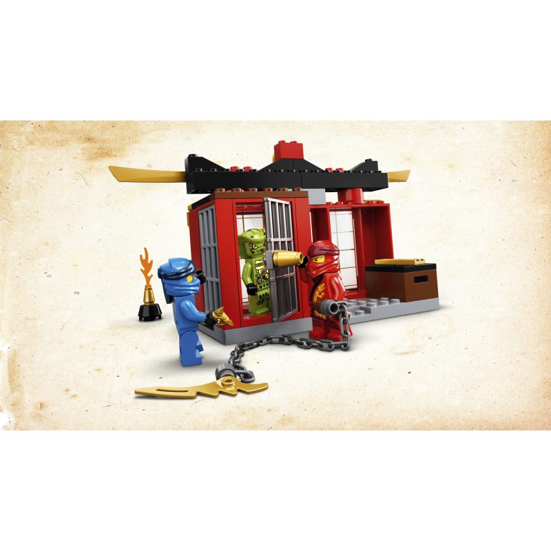 - Zestaw zawiera klocek startowy, który pomoże małym ninja nauczyć się budowania i pozwoli im wymyślać własne przygody ze świata NINJAGO® z minifigurkami Kaia, Jaya, Lashy, zabawkowym samochodem i odrzutowcem oraz świątynią, która ma dołączone więzienie.