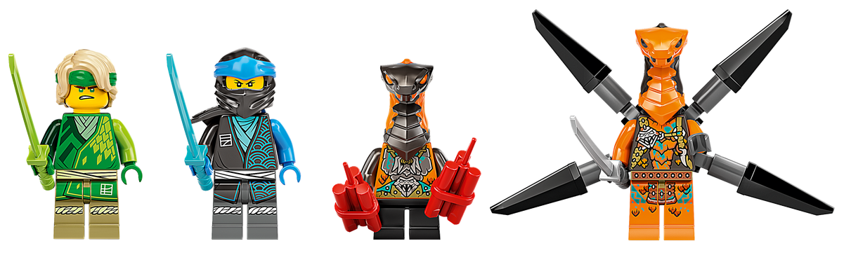 - Cztery minifigurki — Zestaw zawiera uzbrojonego w miecz Lloyda, któremu można założyć kaptur, Nyę z mieczem, latającą żmiję z plecakiem odrzutowym i mieczem, a także Pytona Dynamit z dynamitem i balistą