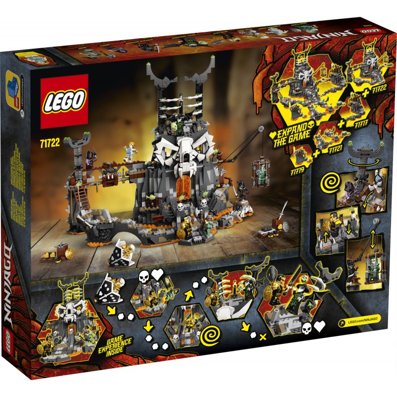 - Zestaw LEGO® NINJAGO® Lochy Szkieletowego Czarownika (71722) zawiera osiem figurek, więc dzieci mogą ponownie przeżyć emocjonujące przygody w lochach znanych z serialu NINJAGO®. Spinner-kostka pozwala przenieść zabawę na planszę do gry LEGO®, więc dawka rozrywki jest podwójna.