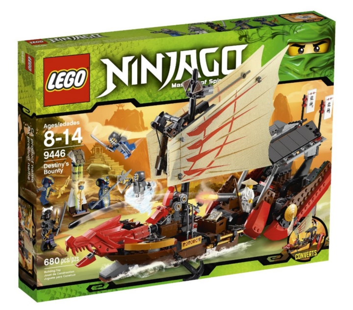 Perła Przeznaczenia 9446 z serii Lego Ninjago to posiadający wiele ciekawych funkcji latający statek ninja. By rozpocząć podniebną wyprawę wystarczy jednych ruchem dźwigni rozłożyć żagle oraz obrócić do dołu silniki znajdujące się na rufie. Po dotarciu do celu możemy zarzucić kotwicę, która jest wyposażona w ręczny mechanizm wyciągania jej na pokład. Podczas walki z Lordem Garmadonem i jego ludźmi przyda się pokładowa armata oraz miecze ukryte w schowkach na burcie statku. Stocz decydującą bitwę, w której może się rozstrzygnąć los świata Ninjago!
