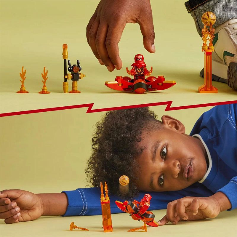 Dzieci mogą umieścić Kaia ze smoczą mocą w spinnerze, a następnie uderzyć jedno z jego ramion i patrzeć, jak Kai wykonuje niesamowite salto w tył. Jego zadaniem jest omijanie ognistych przeszkód, pokonanie figurki droida imperialnego i złapanie elementu rdzenia energii złotego smoka od góry zbudowanego z klocków płonącego uchwytu. Jest też pomarańczowy element mocy smoka, a dzieci mogą zebrać jeszcze cztery elementy w różnych kolorach w innych zestawach NINJAGO®.