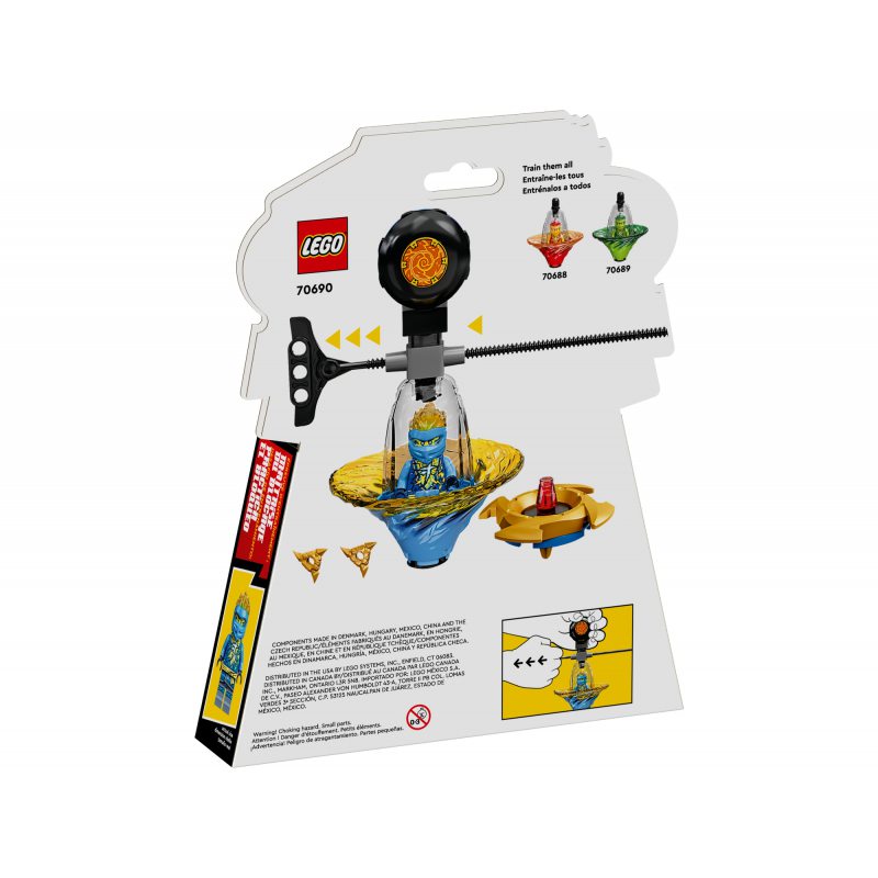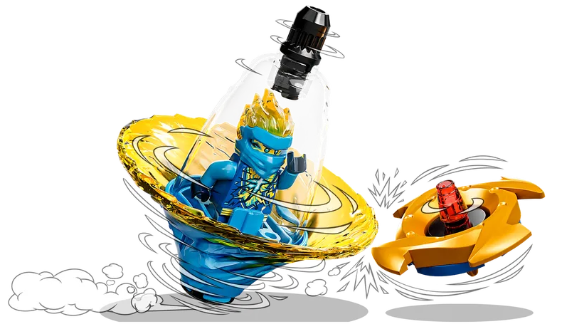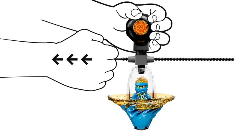 Dzieci mogą umieścić Jaya w obrotowej zabawce, pociągnąć linkę i popatrzeć, jak szybko obraca się na płaskiej powierzchni albo na swojej wysokiej wieży do ćwiczenia równowagi. Minifigurka Jaya ma wyjątkowy, dotąd niespotykany nadruk wspaniałej mocy żywiołu (nowość na marzec 2022 r.).
