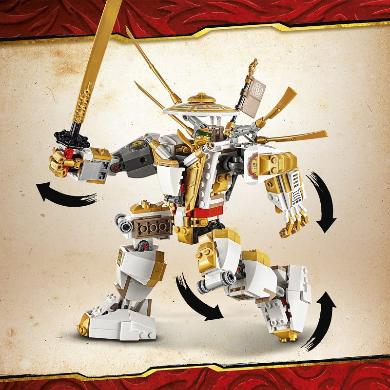 - W zestawie wielki zloty mech z opowieści o ninja i cztery minifigurki: Złoty Ninja Lloyd, Wu, Generał Kozu i Zwiadowca Kamiennej Armii. Fantastyczny świat z jego emocjonującymi bitwami na długo wciągnie dzieciaki.