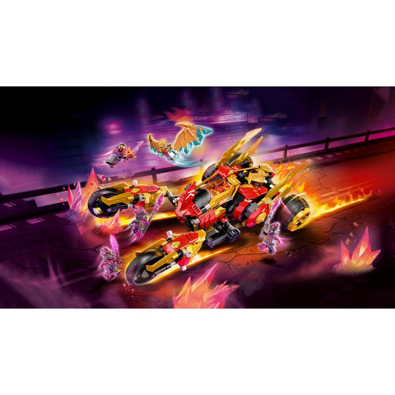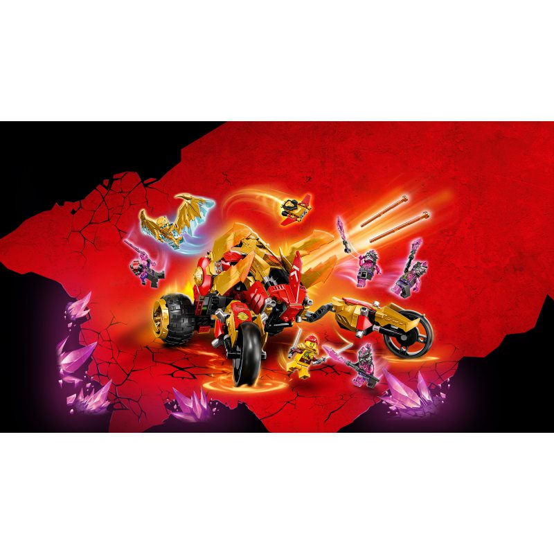 Ośmioletni i starsi fani wojowników ninja mogą odgrywać pełne emocji sceny z serialu NINJAGO®: Crystallized dzięki zestawowi Złoty smoczy ścigacz Kaia (71773). Pociechy znajdą tu pojazd terenowy z kokpitem, dwoma działkami z czterema miotaczami oraz złotymi smoczymi ostrzami. Składając tylne koła ścigacza, można go zmienić w maszynę kroczącą.