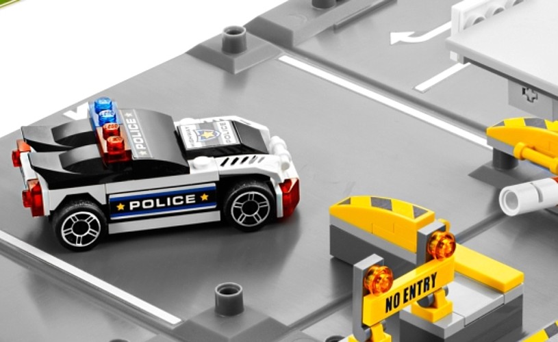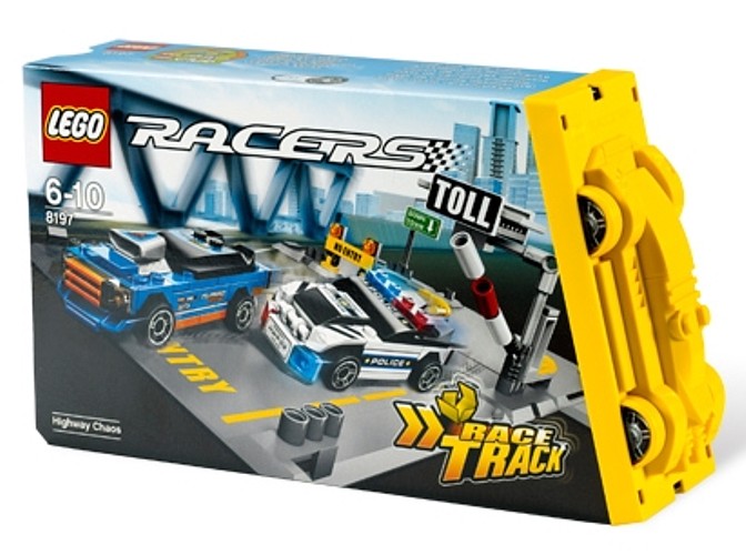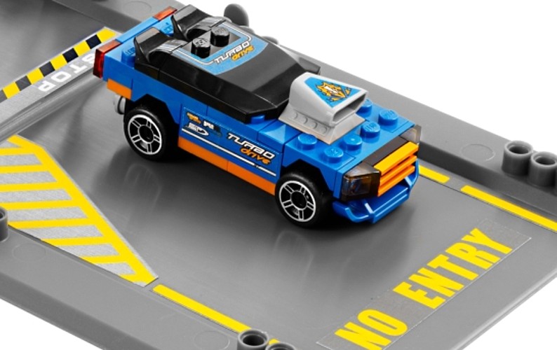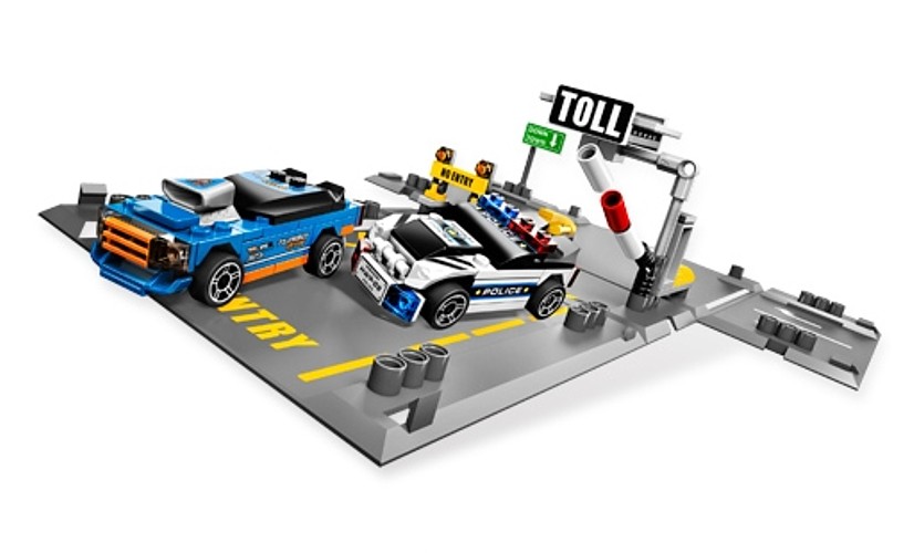 Chaos na autostradzie z serii Lego Racers spowodowany jest przez uciekających złodziei! Otwórz opakowanie i przygotuj tor pościgu! Niebieski podrasowany samochód złamał prawo i próbuje uciec, ale na czas przyjeżdża policyjny radiowóz! Zestaw z łączy się z innymi zestawami z tej serii.