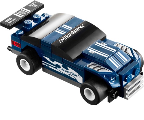 Ten samochód Tiny Turbo z turbodoładowanym silnikiem V8 i szerokimi oponami jest bardzo szybki, nawet przy pokonywaniu ciasnych zakrętów. Możesz także dodać go do dowolnego z rozkładanych zestawów lub stworzyć potężną ciężarówkę wyścigową, korzystając z części pojazdu 8192 Zielony ścigacz.