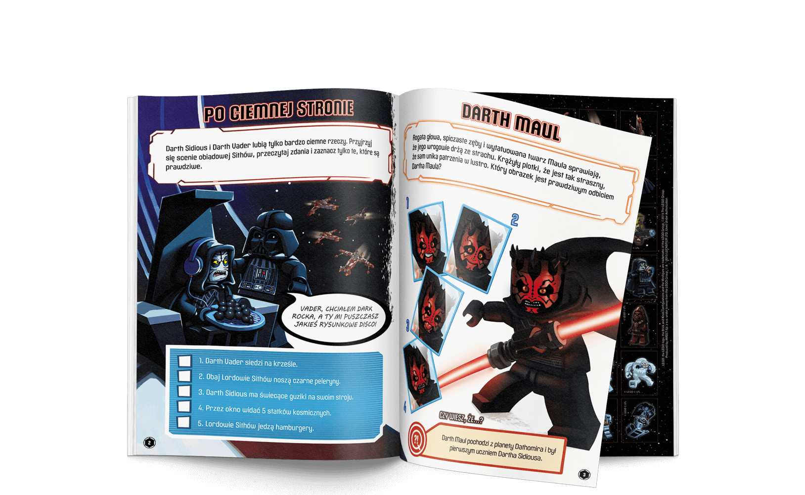 Poznaj najmroczniejszych Sithów, Dartha Sidiousa i Dartha Vadera! Towarzysz im w równie mrocznych misjach i zobacz, jak za wszelką cenę chcą pokonać Jedi! Rozwiązuj pasjonujące zadania, czytaj pełne akcji i humoru komiksy oraz opowiadanie. Niech MOC będzie z Tobą – rozpocznij swoją przygodę w świecie LEGO® Star Wars™ i baw się, jak nigdy dotąd.