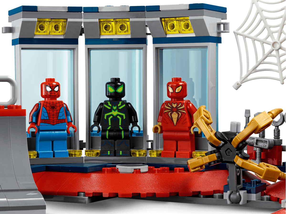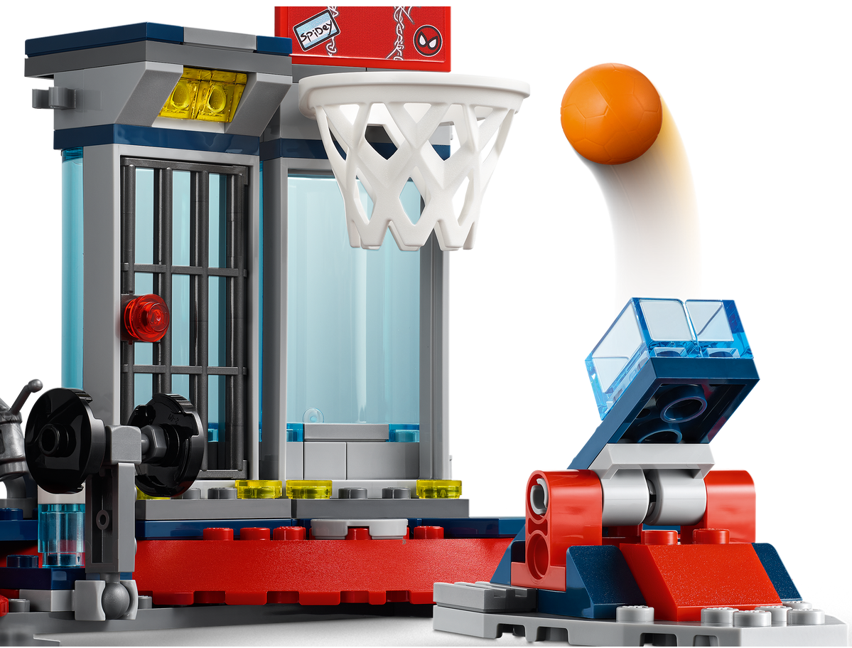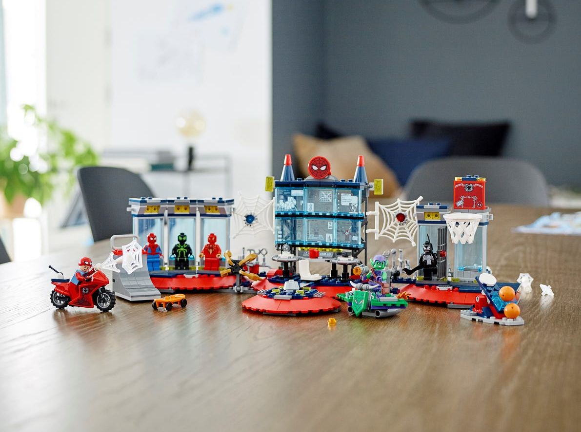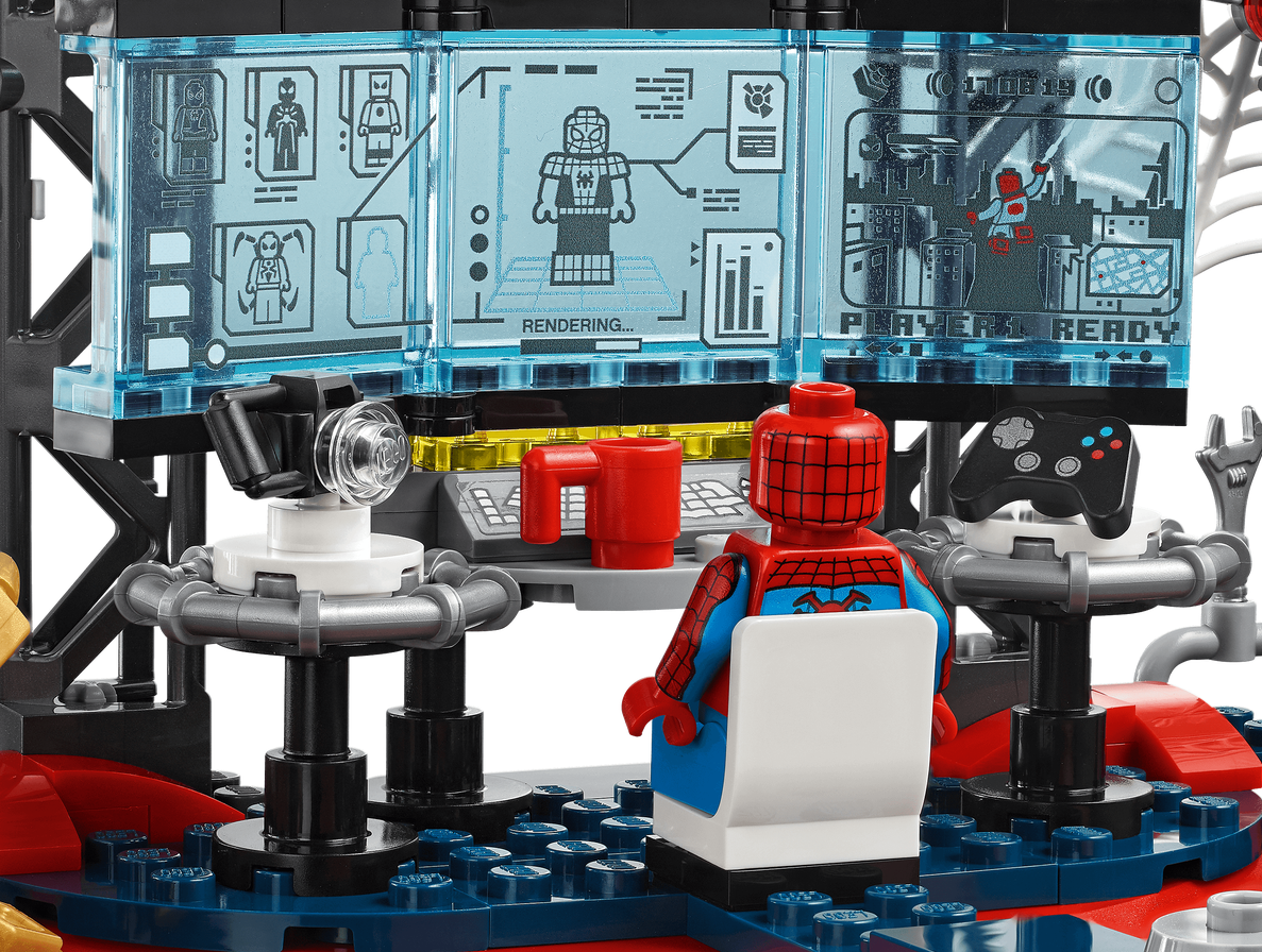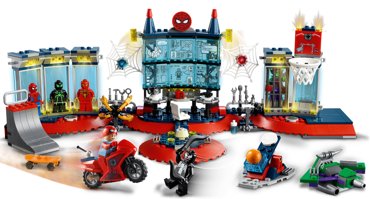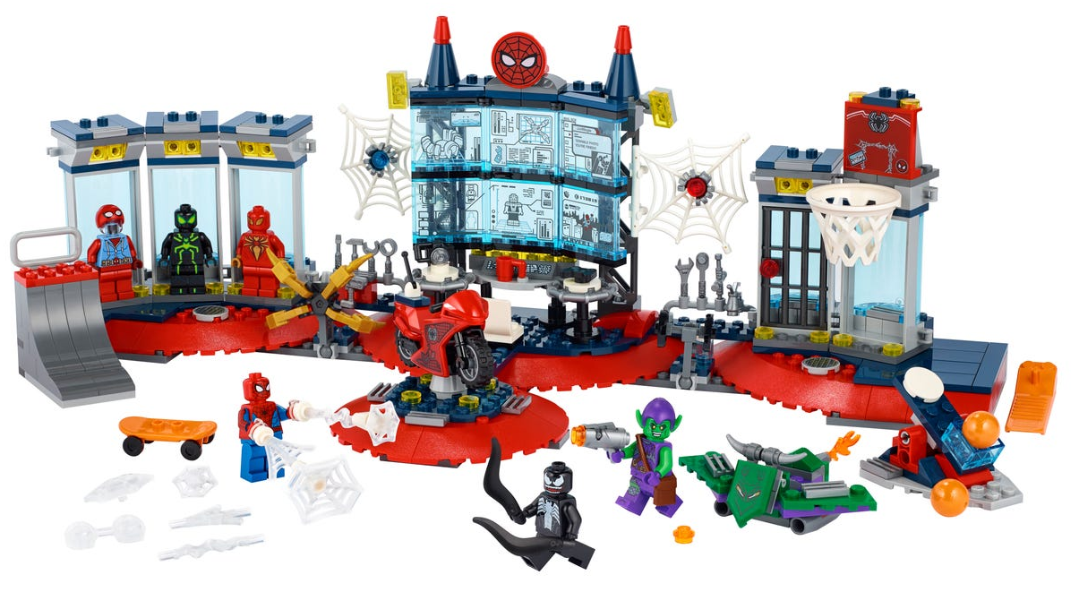 - W komplecie minifigurki Spider-Mana, Zielonego Goblina i Venoma, a także komputer, PlayStation, kosz do koszykówki, rampa z deskorolką, kącik z napojami, aparat, sprzęt treningowy, motocykl, zbroja Żelaznego Pająka, broń i więzienie.