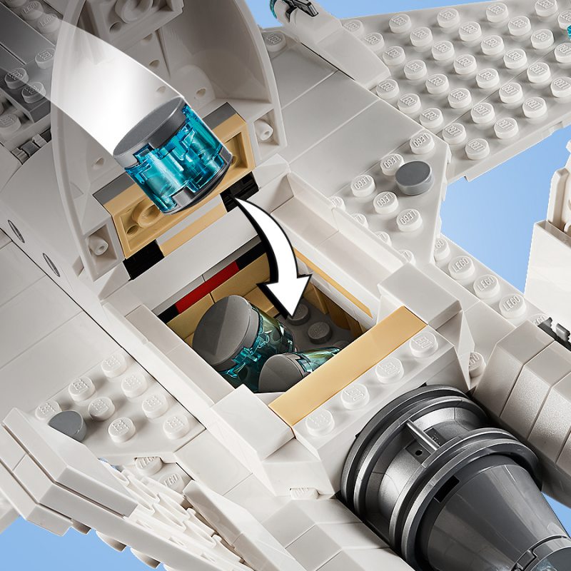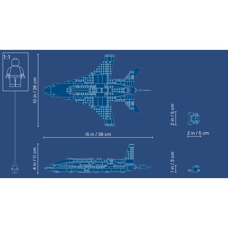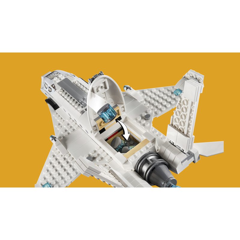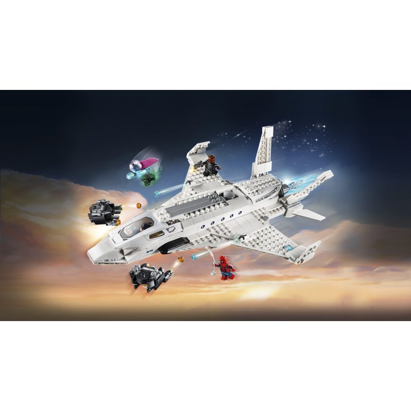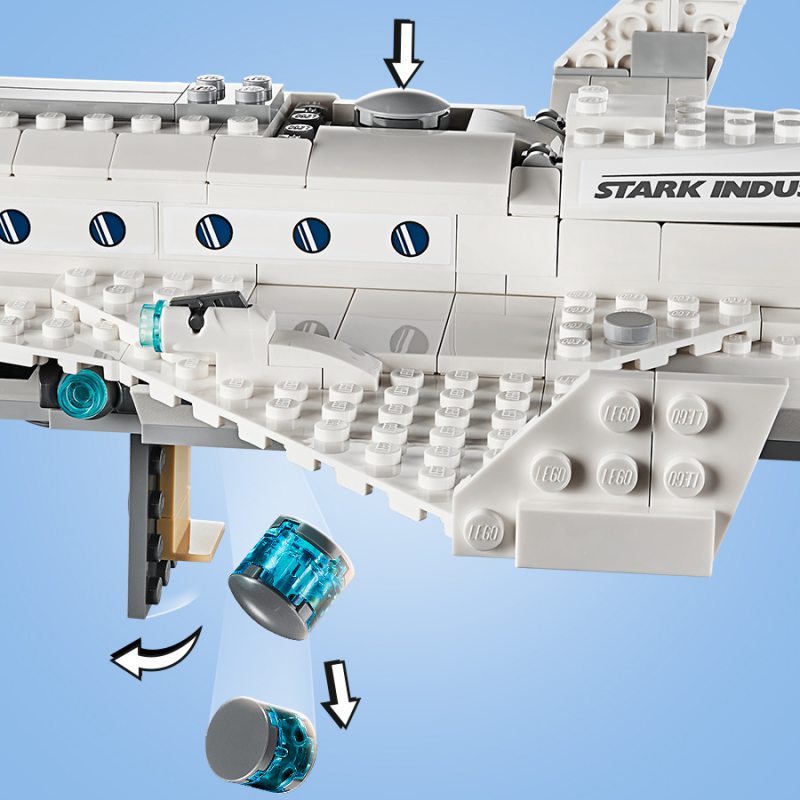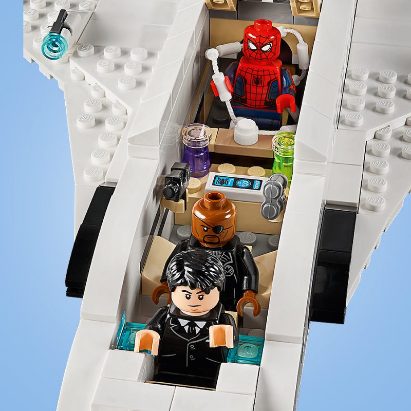 - W kokpicie odrzutowca Starka znajdują się dwa siedzenia dla pilotów, którymi są Happy Hogan i Nick Fury, a także naklejki przedstawiające panel sterowania, dwa pistolety oraz siedzenie dla pasażera, na którym można posadzić Spider-Mana. Samolot ma również funkcję otwierania włazu z miejscem do przyczepienia pajęczyny Spider-Mana, komorę bombową z tyłu na trzy bomby energetyczne do zbudowania, ruchome skrzydła oraz dwa miotacze klocków.