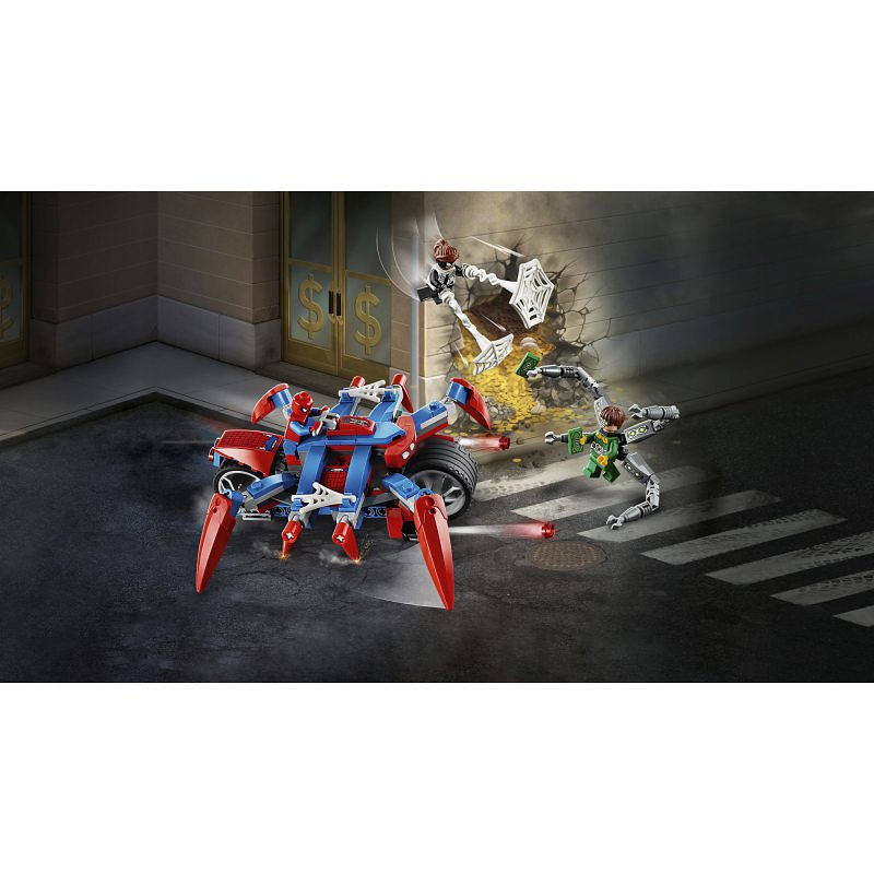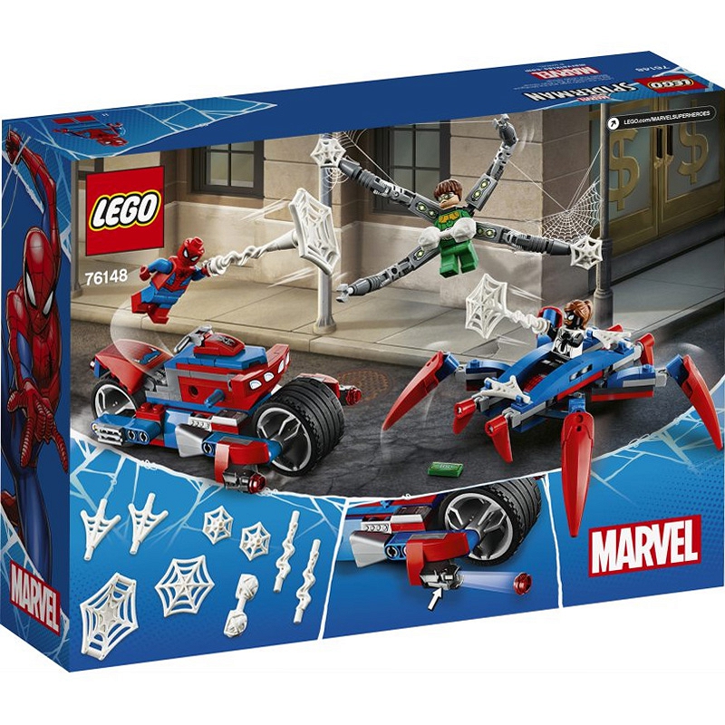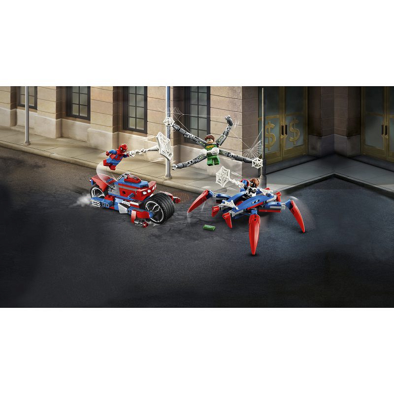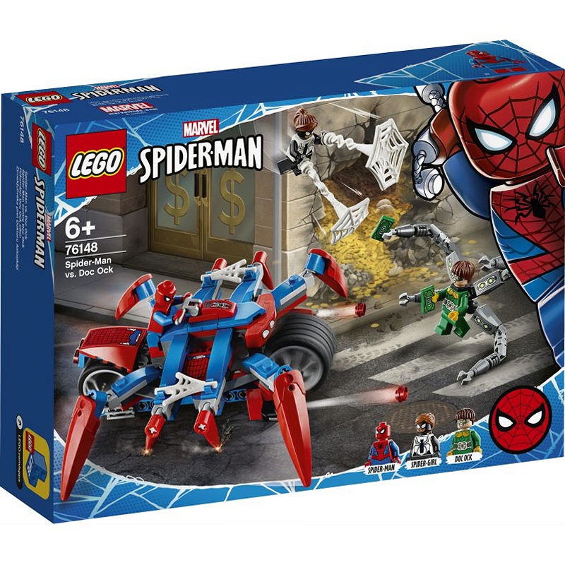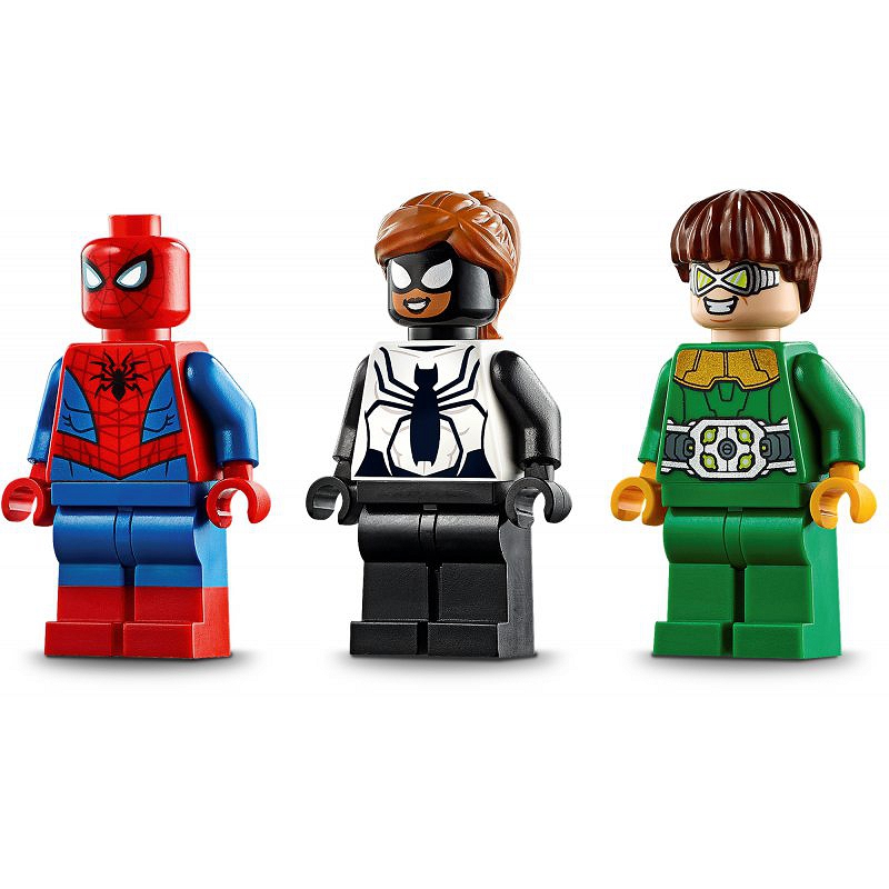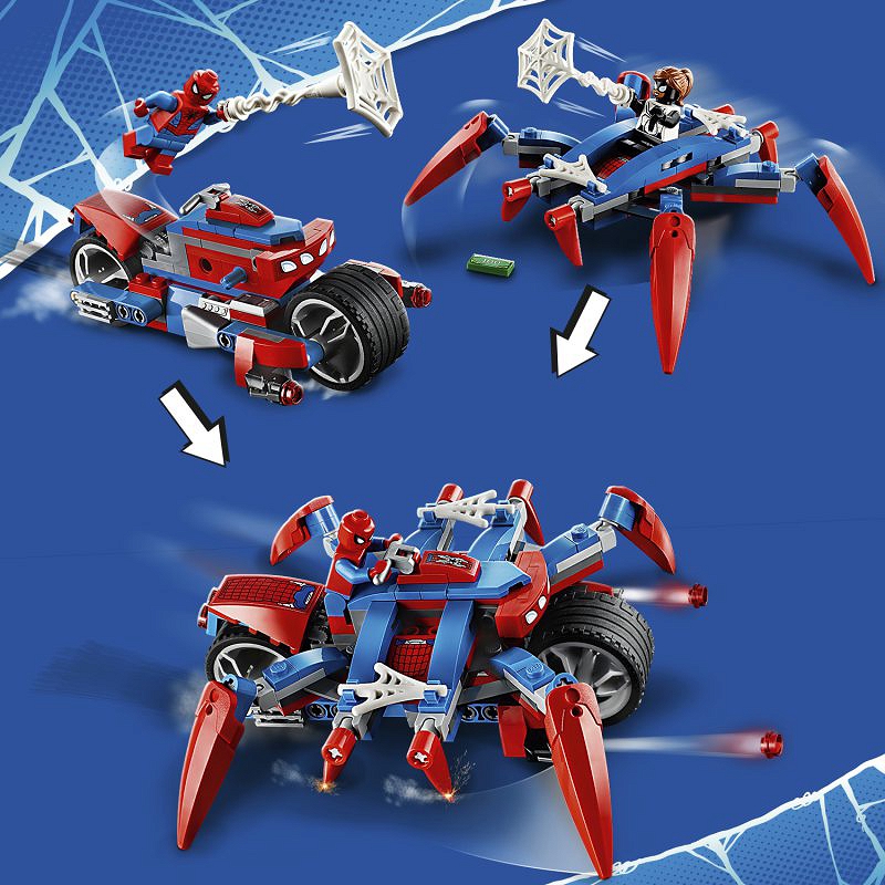 - Trzy minifigurki LEGO® pozwolą dzieciakom wcielić się w role Spider-Mana, Spider-Girl i Doca Ocka w czasie pełnego emocji starcia. Motocykl Spider-Mana można podzielić na dwie części: szybki motor i ogromnego, mechanicznego pająka!