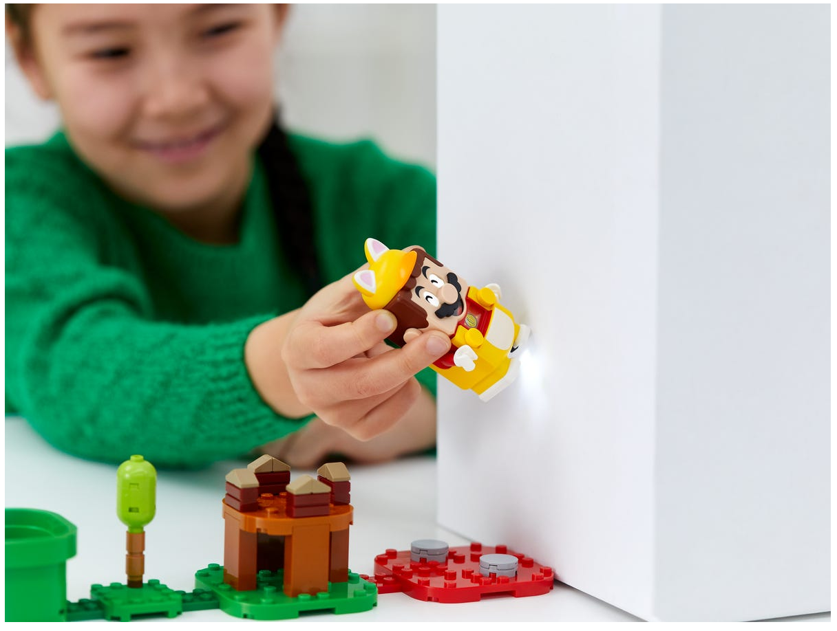 - Po założeniu kostiumu figurka LEGO® Mario™ mruczy i miauczy. Zyskuje również specjalną zdolność do wchodzenia po pionowych przeszkodach i zbierania cyfrowych monet, które poprawiają wynik gracza.