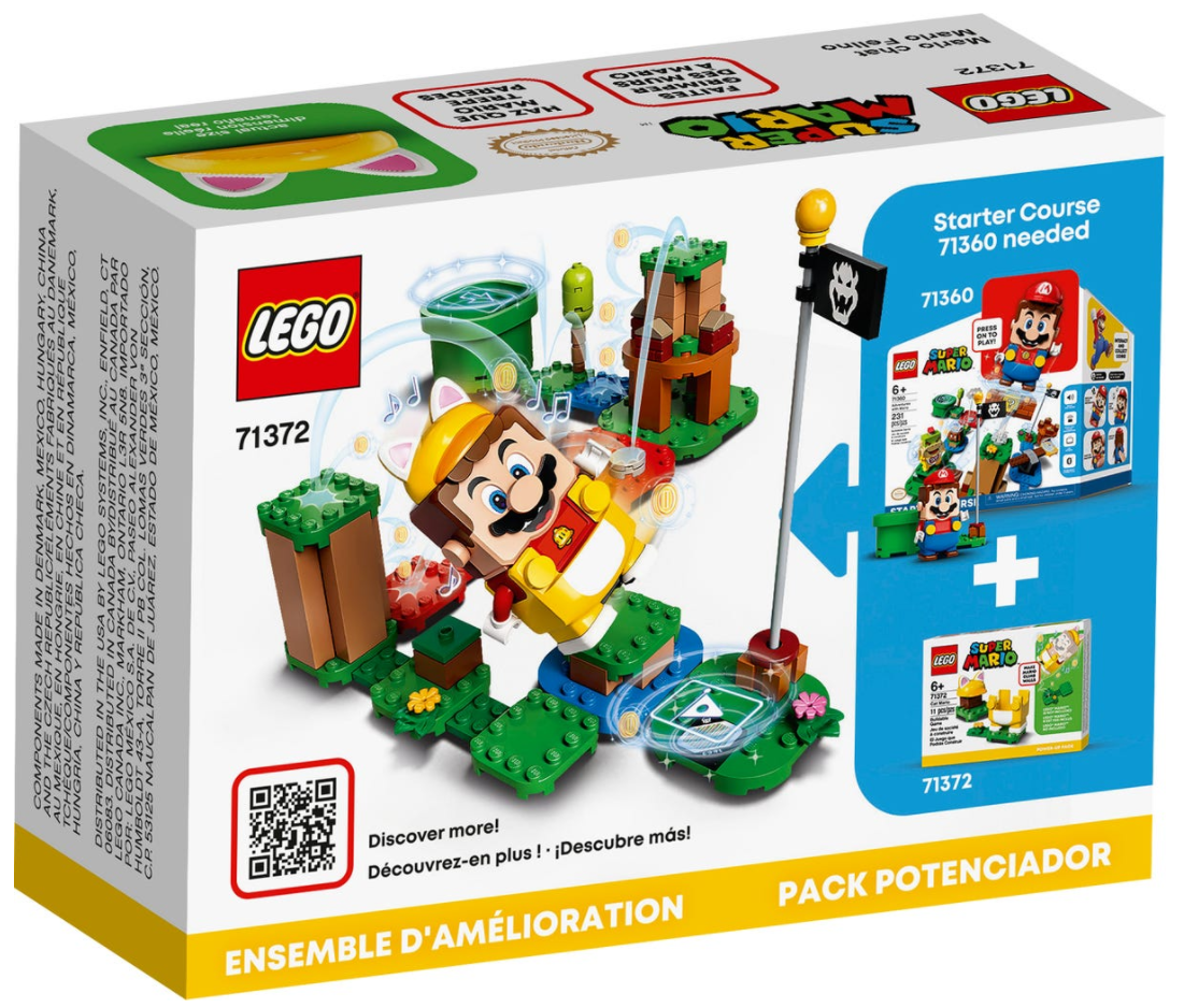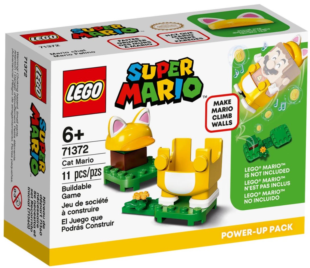 Zestaw Mario kot — ulepszenie (71372) sprawi, że LEGO® Super Mario™ zyska nowe cechy, a zabawa stanie się ciekawsza. Jest w nim interaktywny strój dla figurki LEGO Mario™ (samej figurki brak w komplecie), dzięki któremu zaczyna ona mruczeć i miauczeć, a do tego może wchodzić na ściany i zdobywać za to cyfrowe monety. Ta wyjątkowa zabawka będzie świetnym prezentem dla dzieci, które mają już zestaw Przygody z Mario — poziom startowy (71360) z figurką LEGO Mario.