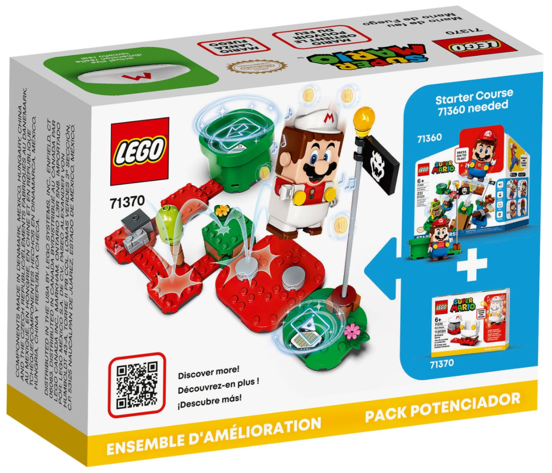- Zestaw Poziom startowy i zestawy dodatkowe LEGO® Mario™ można uzupełnić także o inne ulepszenia, takie jak Helikopterowy Mario — ulepszenie (71371), Mario kot — ulepszenie (71372) oraz Mario budowniczy — ulepszenie (71373).