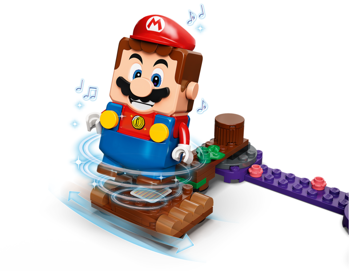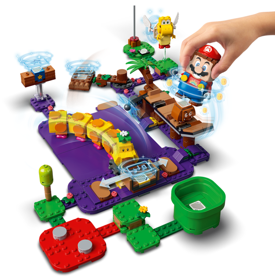 Rozbuduj swój zestaw startowy LEGO® Super Mario™ o zestaw rozszerzający z mnóstwem akcji i Bąbelkową Dżunglą, w której czeka Wiggler! Rozpraw się z nim, aby odkryć tajemniczy most, tylko uważaj na Goombę, który schował się pod spodem! Zatrutego bagna unikniesz dzięki obrotowej platformie i tratwie. Później poszukaj bloku supergwiazdy, który da Ci niesamowitą moc do walki z Koopą Paratroopą i gotowe — to już koniec wspaniałej podróży!