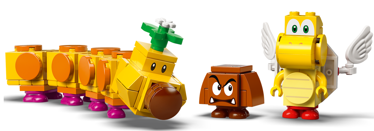 - W zestawie figurki LEGO® kultowych wrogów Super Mario™ — Wiggler, Goomba i Koopa Paratroopa, by LEGO® Mario™ miał z kim walczyć (figurki brak w zestawie).