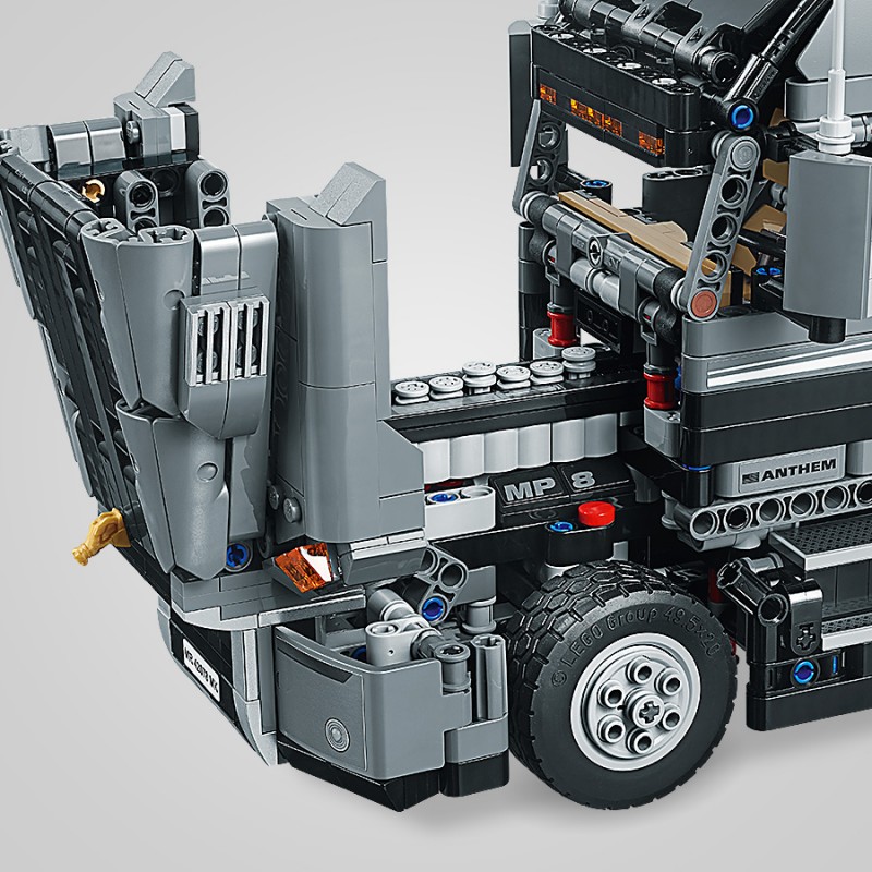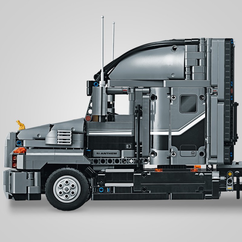 Ta realistyczna replika LEGO® Technic ciężarówki MACK® Anthem™ z przyczepą to okazja, by zapoznać się ze światowej klasy dziełem projektantów i inżynierów. Ten opracowany wspólnie z firmą MACK Trucks Inc. model posiada szereg technicznych szczegółów i funkcji, które przybliżają go do oryginału. Jest tam układ kierowniczy działający na przednie koła, tylny napęd oraz 6-cylindrowy, rzędowy silnik z poruszającymi się tłokami oraz kręcącym się wentylatorem chłodnicy. Odłączana przyczepa ma dwa rodzaje podpór, zsynchronizowane ramiona dźwigu z możliwością załadunku bocznego, a także kontener z zamykanymi drzwiczkami, który można załadować na przyczepę. W łatwo dostępnej kabinie kierowcy znajdziesz z kolei otwierane drzwi, regulowane fotele, pełną detali deskę rozdzielczą, kierownicę, osłony przeciwsłoneczne i piętrową pryczę. Zaawansowany zestaw konstrukcyjny typu 2 w 1 zawiera też charakterystyczne logo MACK z buldogiem do umieszczenia na masce i poza modelem podstawowym umożliwia zbudowanie szczegółowej repliki śmieciarki MACK® LR.