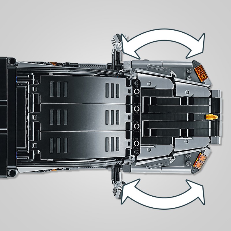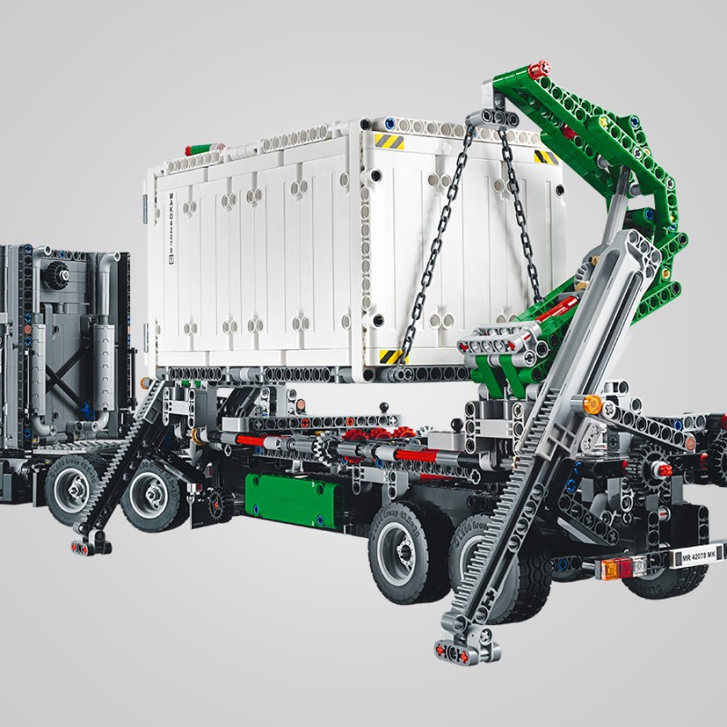 - Model jest utrzymany w realistycznych barwach szarości, czerni, bieli i zieleni. Zaparkuj ciężarówkę w odpowiednim miejscu, opuść i wysuń oba rodzaje podpór, a potem za pomocą zsynchronizowanych ramion dźwigu unieś kontener i załaduj go z boku na przyczepę.