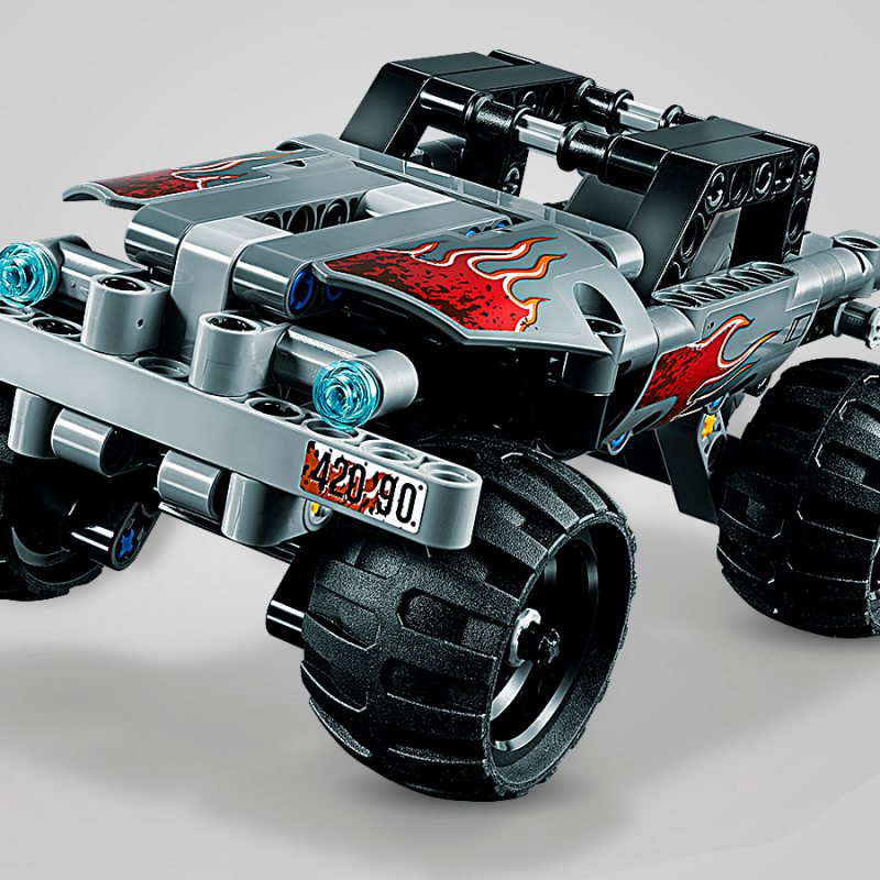 Zestaw LEGO® Technic 42090 Monster truck złoczyńców to przepis na dynamiczną zabawę! Solidny pojazd wyposażony jest w ogromne opony na szerokich felgach, dwie duże rury wydechowe zamontowane po bokach i wytrzymały zderzak z przodu. Model zbudowany jest z czerwonych, czarnych i szarych części oraz ozdobiony naklejkami przedstawiającymi płomienie — tak jak lubią złoczyńcy! Ten mocny model ma także napęd typu pull-back. Można połączyć go z pojazdem typu pull-back z zestawu 42091 Policyjny pościg, by urządzić niezapomniany wyścig samochodowy lub zbudować niesamowitą terenówkę kombi.