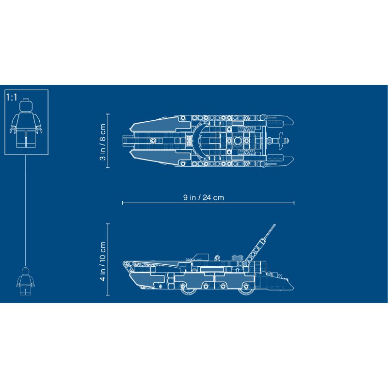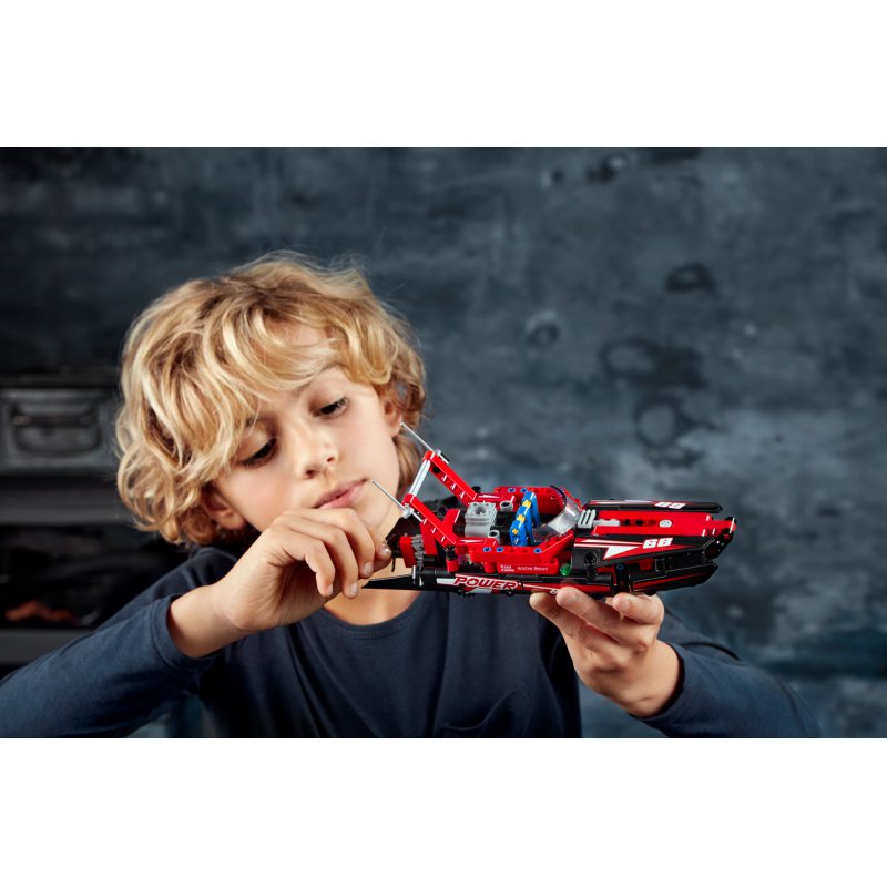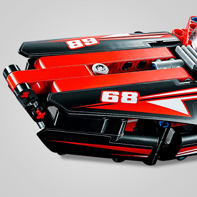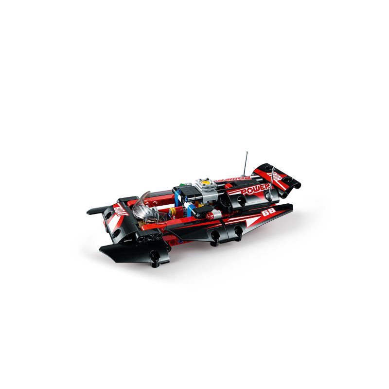 Pędź do mety aerodynamicznym modelem 2 w 1 LEGO® Technic 42089 Motorówka. Łódź w sportowej, czerwono-czarnej kolorystyce wyposażona jest w otwarty kokpit ze sterem i przyciemnianą przednią szybą oraz ozdobiona wyścigowymi naklejkami. Przesuń wytrzymałą motorówkę, by uruchomić tłoki silnika i obrotowy wirnik z tyłu, a potem przebuduj ją na elegancki wodolot — to podwójna dawka budowania i zabawy!