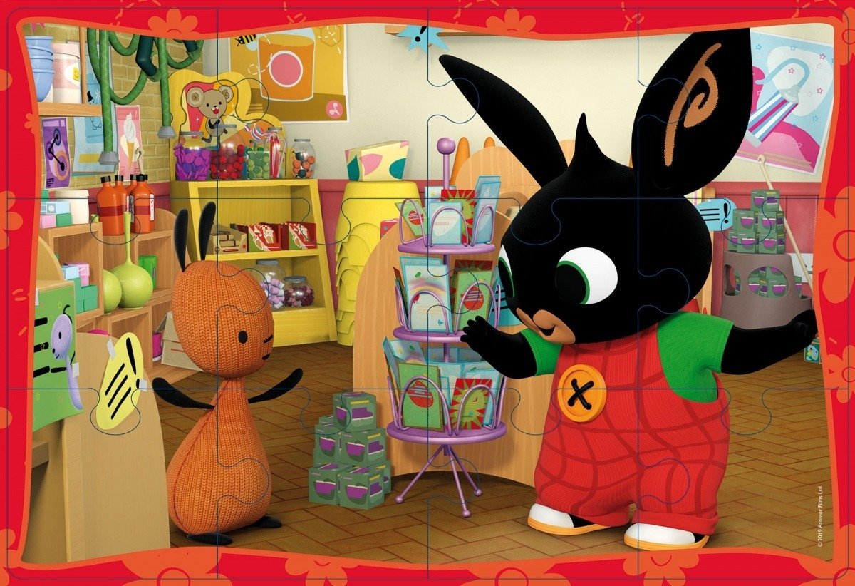 Puzzle składające się z 24 bardzo dużych elementów, zaprojektowane z myślą o wszystkich fanach bajki Bing. Produkt został wykonany z wysokiej jakości materiałów. W zestawie znajdują się 2 obrazki do ułożenia, a każdy składa się z 12 puzzli.