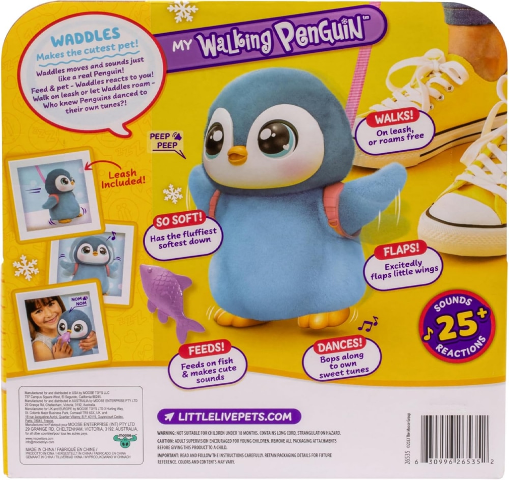 Waddles porusza się i wydaje dźwięki zupełnie jak prawdziwy pingwin. Nakarm go rybką i przytul go – reaguje na Twój dotyk. Zobacz, jak macha skrzydłami i kiwa głową podczas spaceru! Waddles wydaje mnóstwo zabawnych i uroczych dźwięków – je, chichocze, kicha, a czasem nawet puszcza urocze bąki! Dzięki ponad 25 dźwiękom i reakcjom Waddles jest niezwykle interaktywny i uroczy!