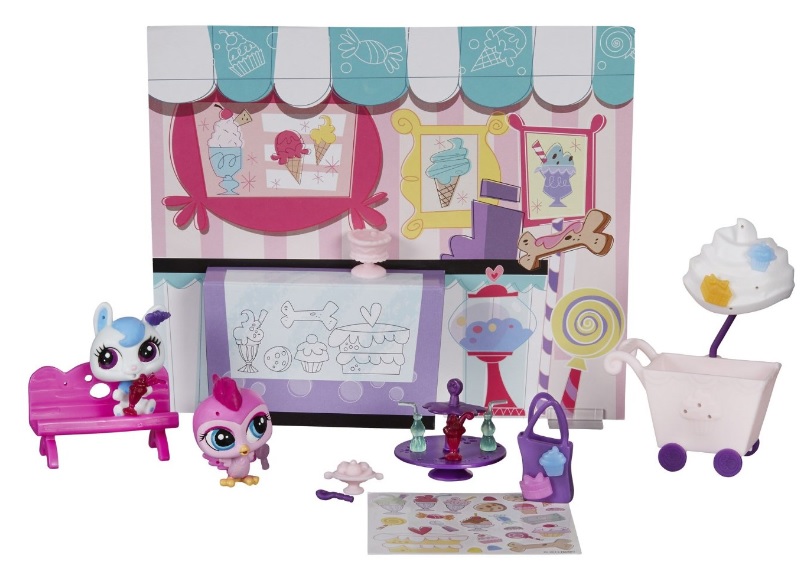 W zestawie Littlest Pet Shop Bar z lodami A8541 znajdziemy dwa zwierzątka Casey i Pinky, grafikę będącą ścianą lodziarni, ławkę, wózek, stojak z ciastakim, ciasto, naklejki oraz inne dodatki.