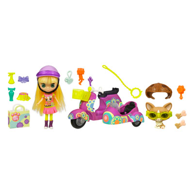 Zabawna laleczka Blythe zna wiele ciekawych miejsc, gdzie można się wybrać na wycieczkę, a skuter to idealny pojazd dla niej. Zabierz w podróż pieska Corgi i pamiętaj o kasku i okularach dla niego i rusz w drogę pełną zabawy.