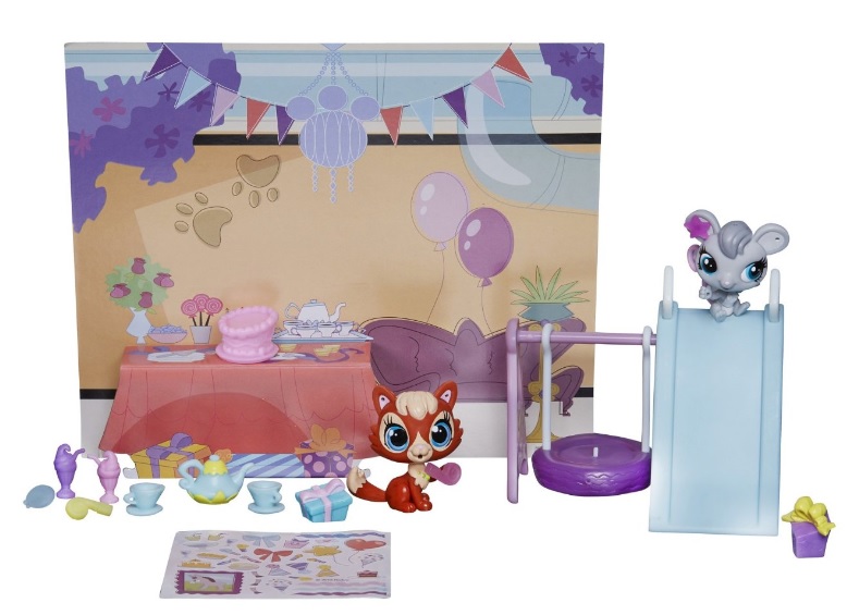 W zestawie Littlest Pet Shop Czas na imprezę A8540 znajdziemy dwa zwierzątka Lucki i Lefly, ścianę, zjeżdzalnie, naklejki, tort, prezent i inne elementy.
