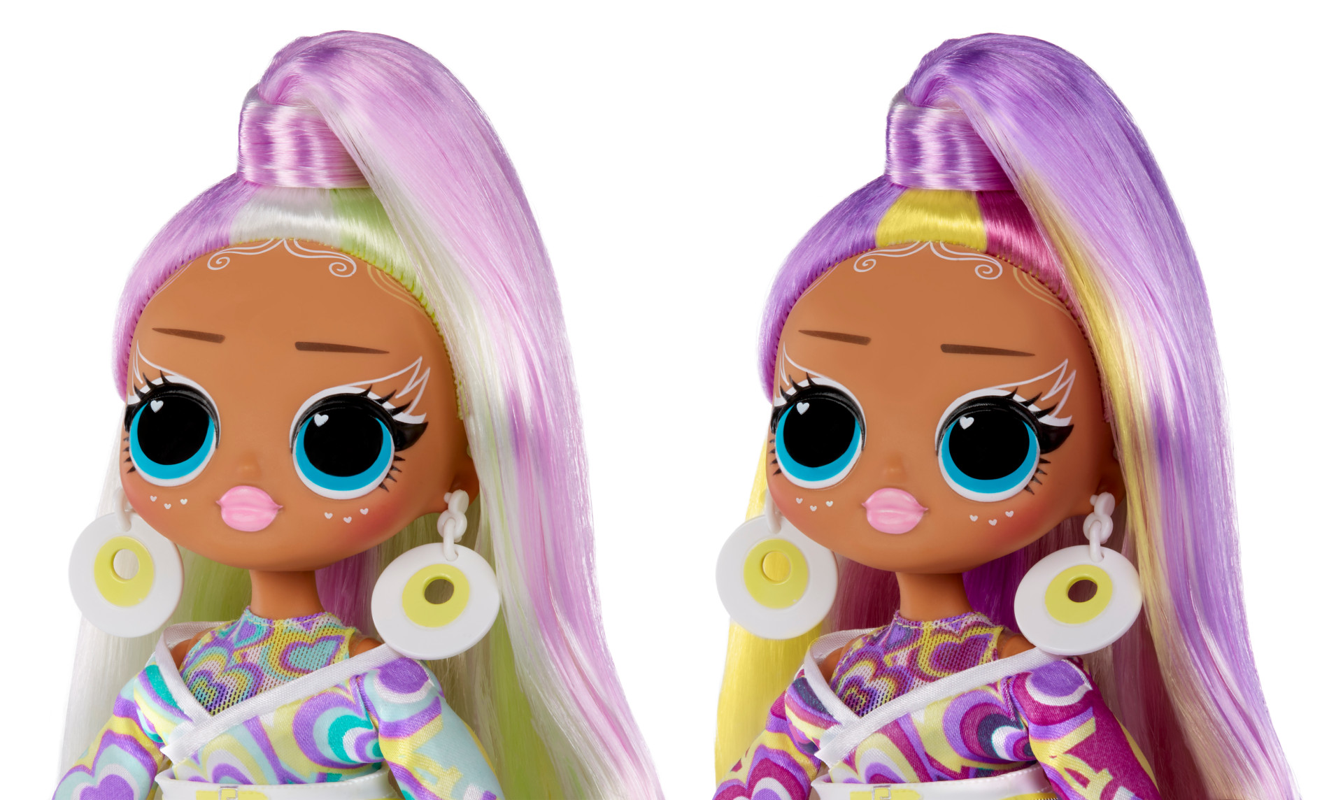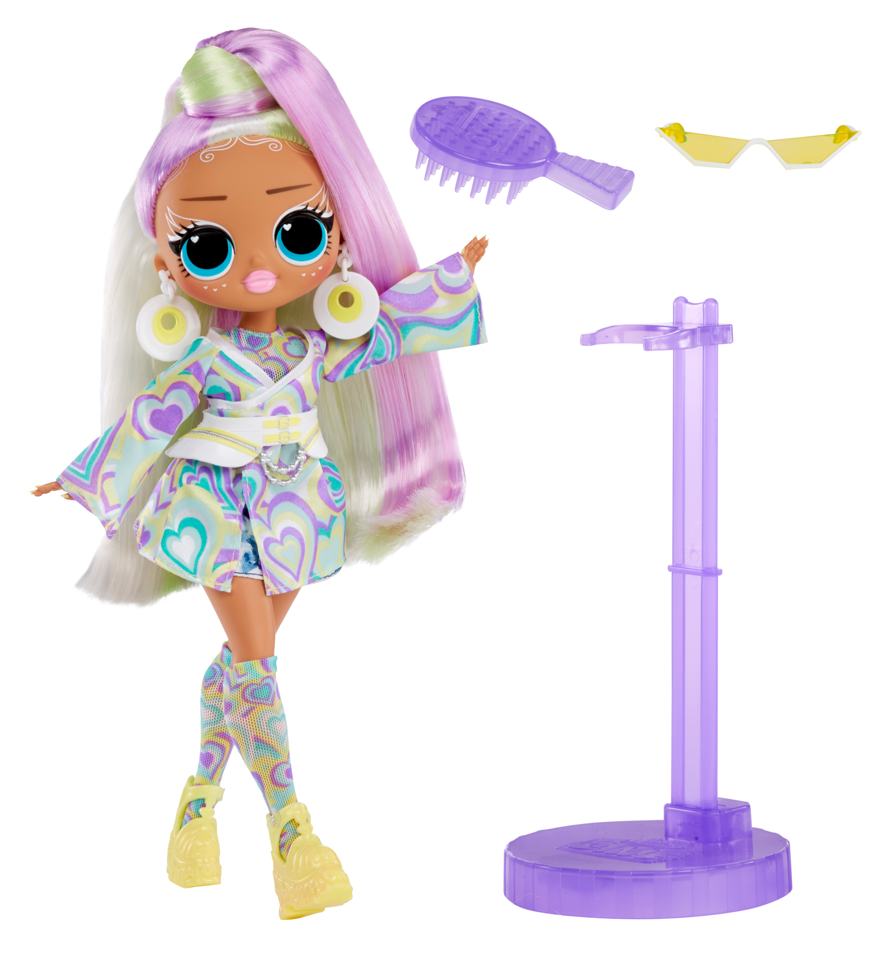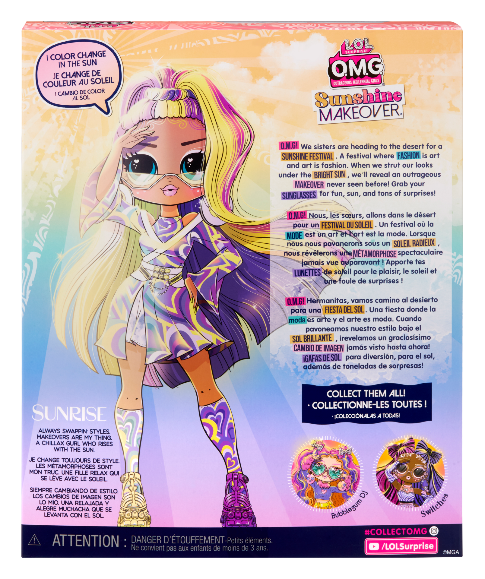 LOL Surprise! OMG Sunshine Makeover Tentpole to wyjątkowe lalki i ich ubrania, które zmieniają kolor pod wpływem światła słonecznego. W zestawie znajduje się urocza laleczka z serii, którą można przebierać do woli. Włosy lalki, jak i ubrania reagują na promienie UV i zmieniają kolor! Sunrise ma ciemną karnację, fioletowo-zielone włosy, niebieskie oczy i brązowe brwi. Uwielbia się przebierać i razem z siostrami pozuje w pełnym słońcu. Zawsze ma ze sobą okulary. Lalka ma ruchome ręce, nogi oraz głowę, dzięki czemu można ustawiać ją w różne pozy i przebierać.