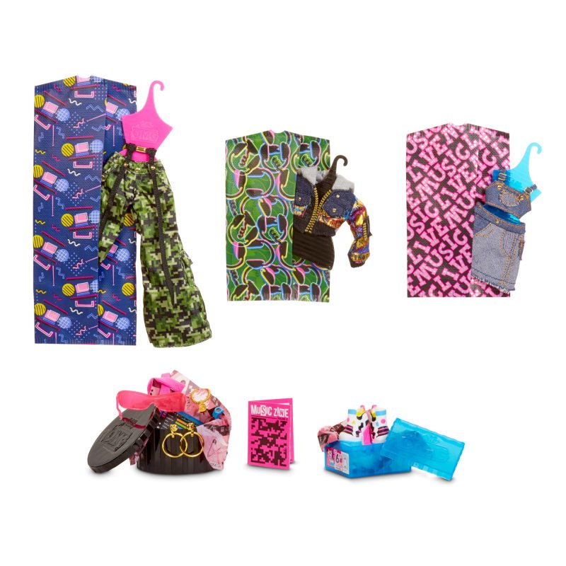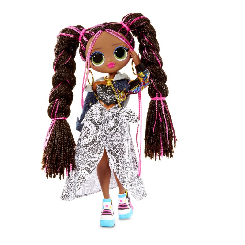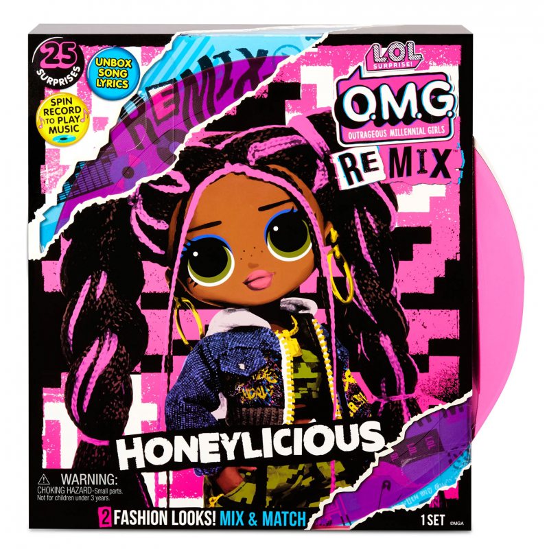 Nadchodzą jeszcze cudowniejsze L.O.L. Surprise O.M.G. – najnowsze odkrycie sezonu! Teraz podczas odkrywania niespodzianki będą Ci towarzyszyć dźwięki muzyki! Masz do odkrycia aż 25 różnych elementów zestawu. Kolorowe pudełko ma formę gramofonu, do którego dołączono płytę "winylowa", która po umieszczeniu jej w odpowiednim miejscu i zakręceniu, uruchamia nowy przebój Pop B.B - w stylu Hip Hop. Gdy przesuniesz dwa "pokrętła" tekturowego gramofonu, znajdziesz pudełeczka z niespodzianką. Każde z nich skrywa elementy garderoby: top i szerokie spodnie moro, kurteczkę z kapturem, dżinsową spódniczkę i top, okulary, kolczyki, buty w sportowym stylu. Wysuń szufladki z bocznej części pudełka, a ukaże się cudowna lalka z trzema wieszakami z ubraniami w pokrowcach, a także książeczka z imieniem lalki i tekstem piosenki wygrywanej przez gramofon. Ta część opakowania to element, który można wykorzystać podczas zabawy jako toaletkę. Dodatkowo zestaw zawiera stojak dla Honeylicious, którą można ustawiać w różnych pozycjach.