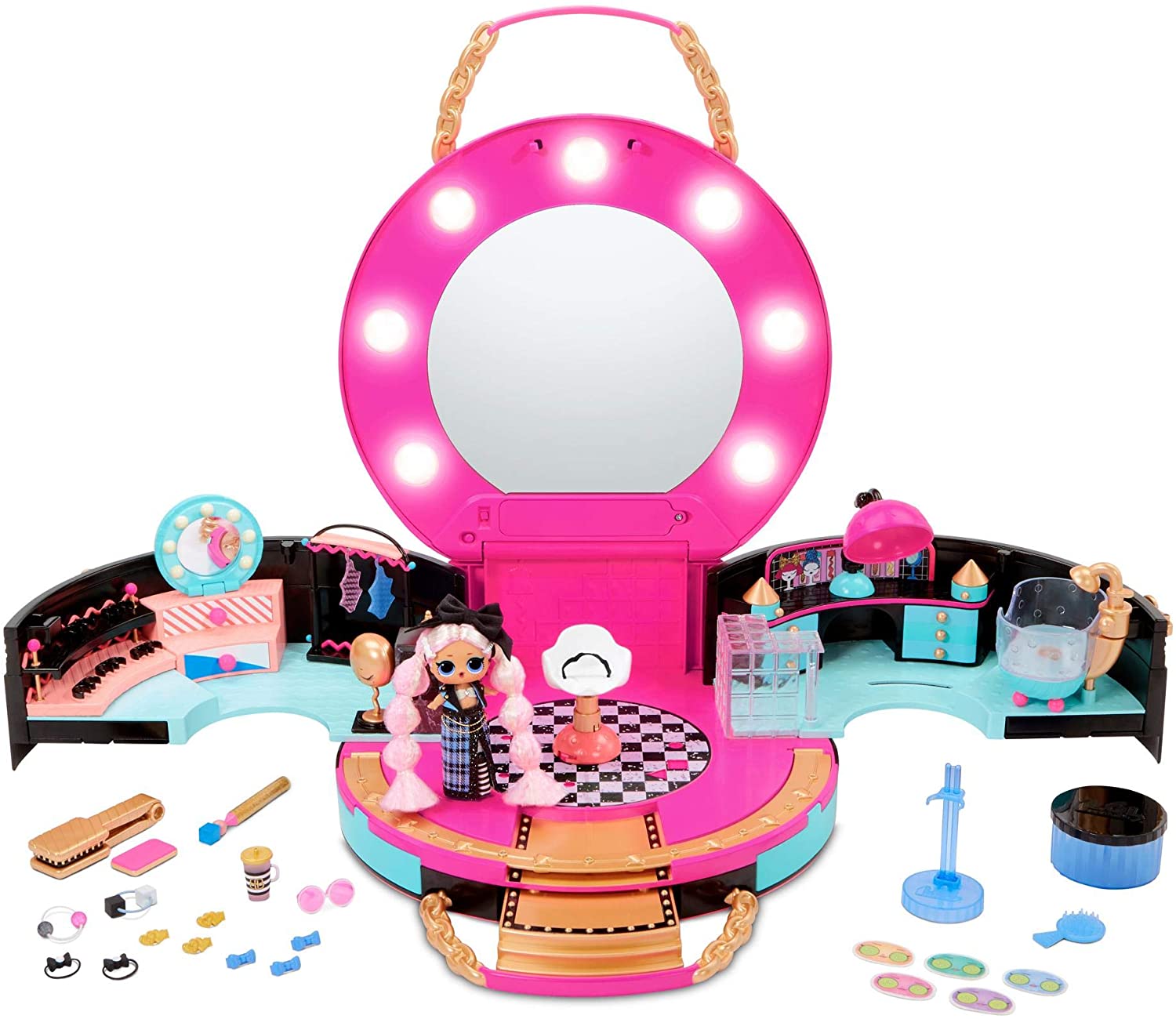 Każda laleczka L.O.L. potrzebuje chwilę relaxu i upiększenia. Teraz możesz zabrać swoje lalki do salonu piękności w którym laleczki odświeżą swoje fryzury oraz przejdą metamorfozę. W salonie możesz laleczką myć włosy, a następnie je wysuszyć i zrobić odjazdowe fryzury. Podczas robienia fryzury możesz nałożyć laleczce maseczkę, aby mogła się jeszcze bardziej zrelaksować. Do zestawu dołączona jest nawet specjalna szczotka z kredą, która pozwala zrobić laleczce pasemka. W skład zestawu wchodzi 50 niespodzianek! Są wśród nich buteleczka, klej z brokatem, okulary, wieszaki do garderoby i wiele innych. W salonie można przejść całkowitą metamorfozę, od fryzury po stylizację. Na koniec laleczka może zaprezentować się na scenie z ogromnym lustrem. Salon schowany jest w walizce, dzięki czemu łatwo go schowasz i możesz zabrać go wszędzie ze sobą.