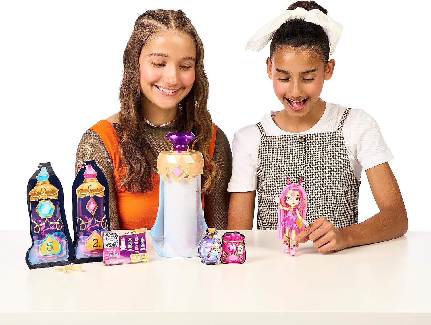 Wejdź do świata magii z Magic Mixies Pixlings! Stwórz magiczny eliksir i odkryj wyjątkową lalkę Pixling – jelonek Deerle z krainy Magic Mixies! Wystarczy dodać wodę i składniki do butelki, a następnie wypowiedzieć zaklęcie „Magicus Mixus”, aby niebieska mikstura stała się przezroczysta, odsłaniając lalkę. Deerle ma piękne, długie włosy, perłowy klejnot na czole oraz miękkie, opalizujące ubranka i ręcznie robione buciki. Lalka ma 16 cm wysokości i 7 punktów artykulacji, co pozwala ustawiać ją w różnych pozach. Butelka może służyć jako pojemnik do przechowywania lalki lub dekoracja. Do zebrania jest 5 unikalnych lalek Pixlings – każda z własną mocą i wyglądem.