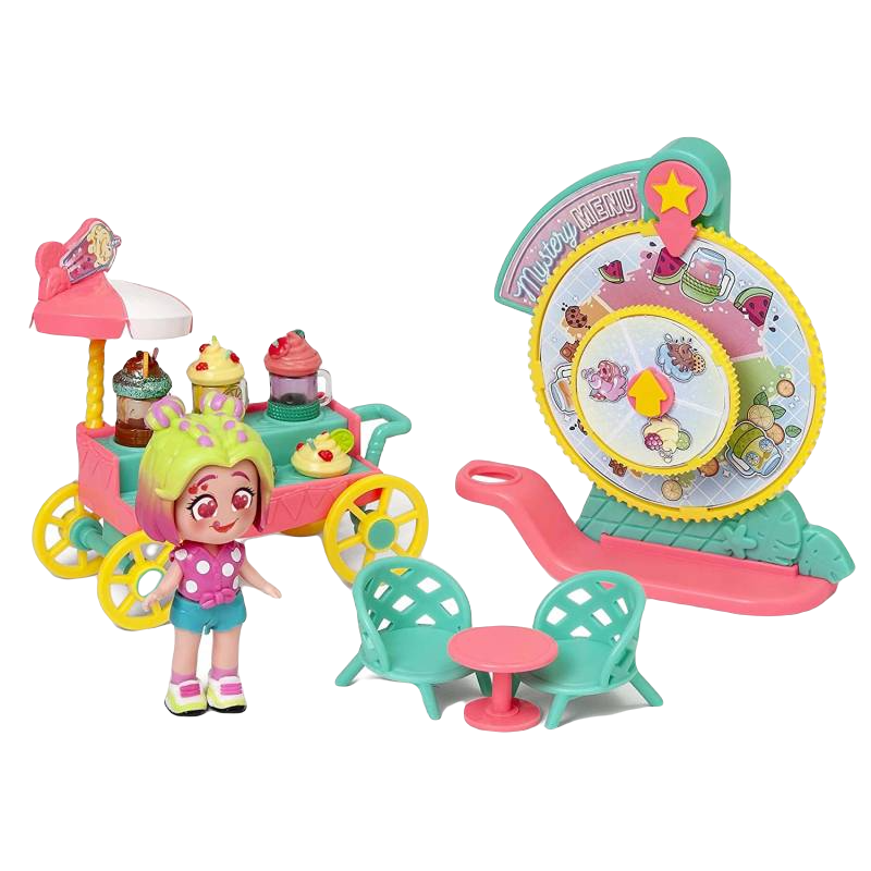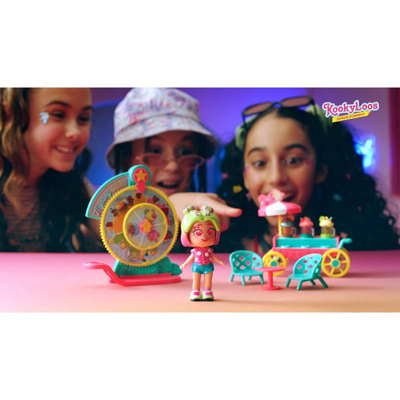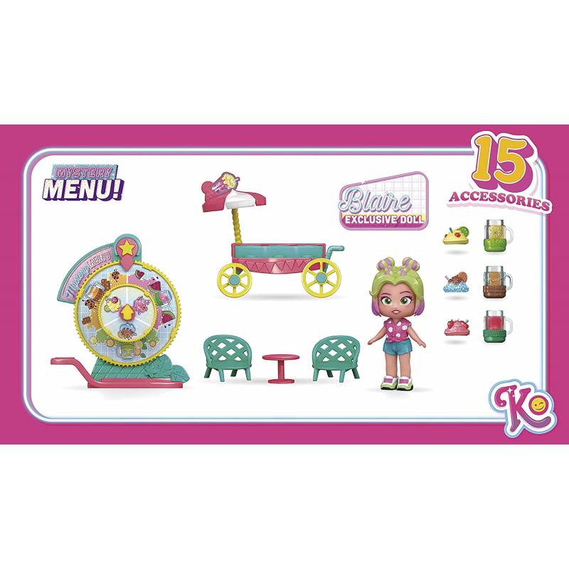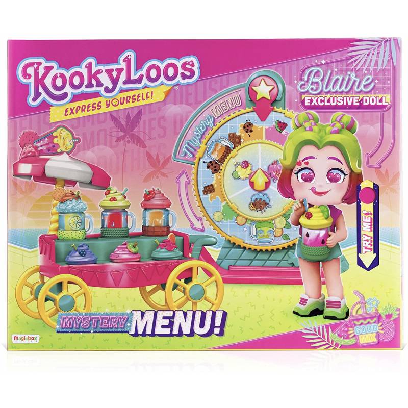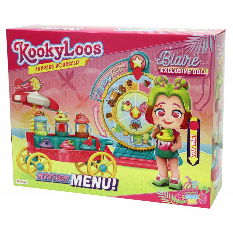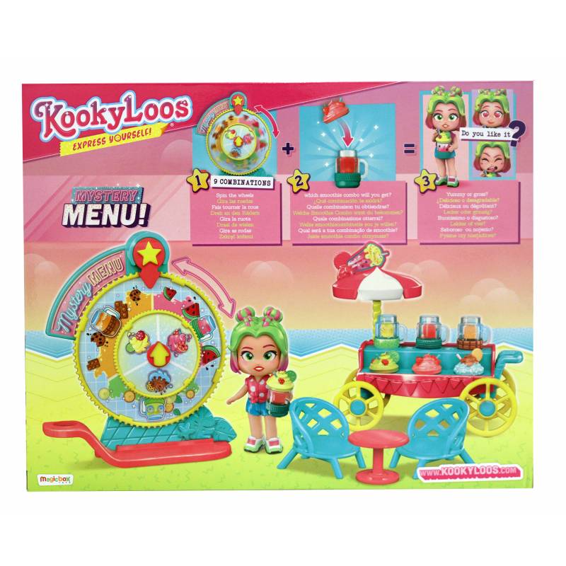 KookyLoos to nowość na rynku zabawek! Małe laleczki są jedyne w swoim rodzaju, posiadają aż trzy ekspresje twarzy, dzięki obracanej głowie można ją szybko zmienić. Różne akcesoria sprawiają, że możemy reagować zabawką na różne sytuacje. W zestawie Mystery Menu możesz rozkoszować się cudownym napojem razem z laleczką Blaire. Zakręć kołem fortuny i wylosuj jakie combo smoothie dostaniesz. Po wylosowaniu mixu, możesz zrelaksować się przy stoliku i krzesełkach.