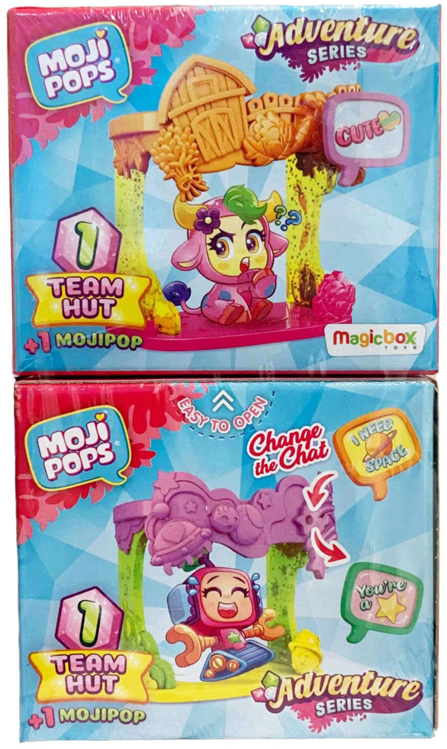 Figurki Moji Pops mieszkają w domkach Team Huts, czyli mini chatkach. W tej serii do zebrania jest 12 Team Huts. Do każdego domku dołączone zostały "chaty", które można wymieniać z innymi domkami z tej serii. W zestawie oprócz Team Huts, znajduje się figurka Moji Pops. Domki można układać w wysoką wieżę.