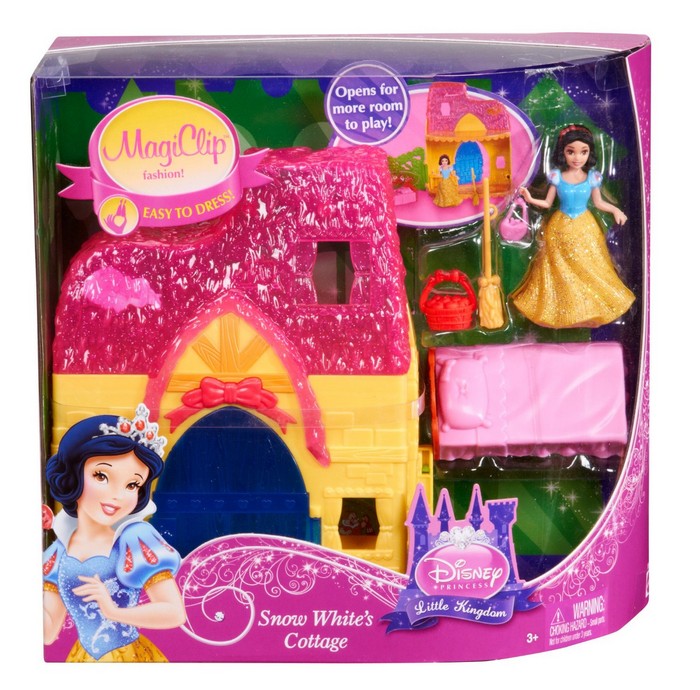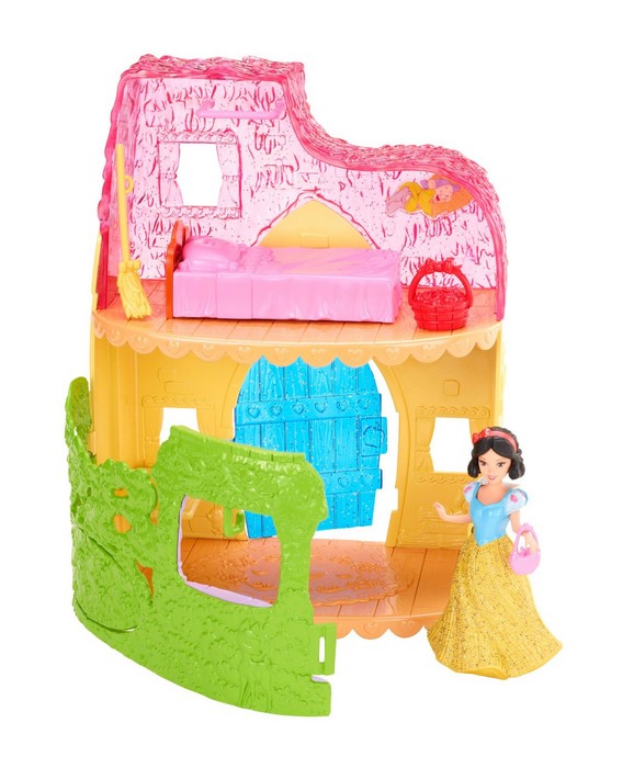 Dwustronny zestaw do zabawy pozwoli dziewczynkom odtwarzać niezapomniane historie z ulubionych bajek. W zestawach dziewczynki znajdą pałac Kopciuszka, wieżę Rospzunki albo chatkę Królewny Śnieżki. W każdym zestawie jest jedna lalka oraz akcesoria, które pomogą odtworzyć w zabawie bajkowy świat.