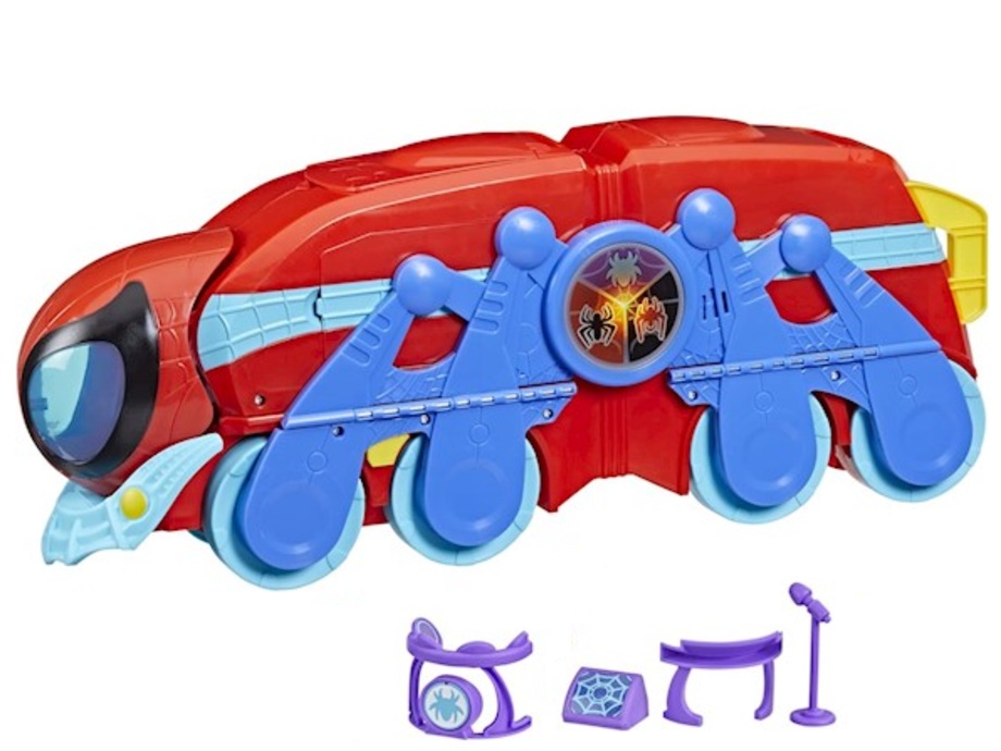 Zanurz się w sieci z ekscytującym zestawem Spidey! Ten zestaw 2w1 Super Hero ze światłami i dźwiękami przekształca się z dużego pojazdu kroczącego w wysoką na 61 cm wieżę HQ! Gdy zestaw jest w trybie wieży, dzieci mogą wyobrazić sobie planowanie misji w centrum dowodzenia, zorganizować udawany pokaz przy użyciu dołączonych akcesoriów do instrumentów, huśtać się na ramieniu pajęczyny i nie tylko! Wyciągnij rampę. Zarówno w trybie pojazdu, jak i zestawu, przedszkolaki mogą wyrzucić pajęczy zderzak, by zepchnąć z drogi wichrzycieli! Dzięki temu zestawowi dzieci mogą poczuć się częścią akcji Drużyny Pająka!