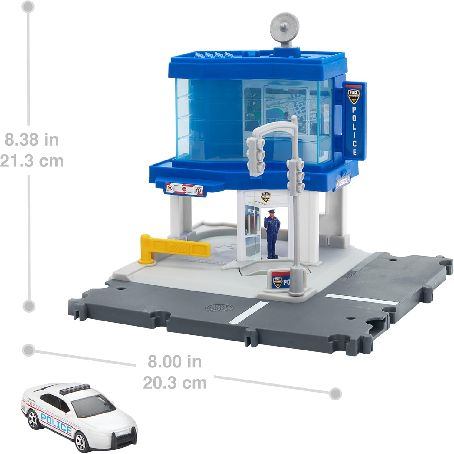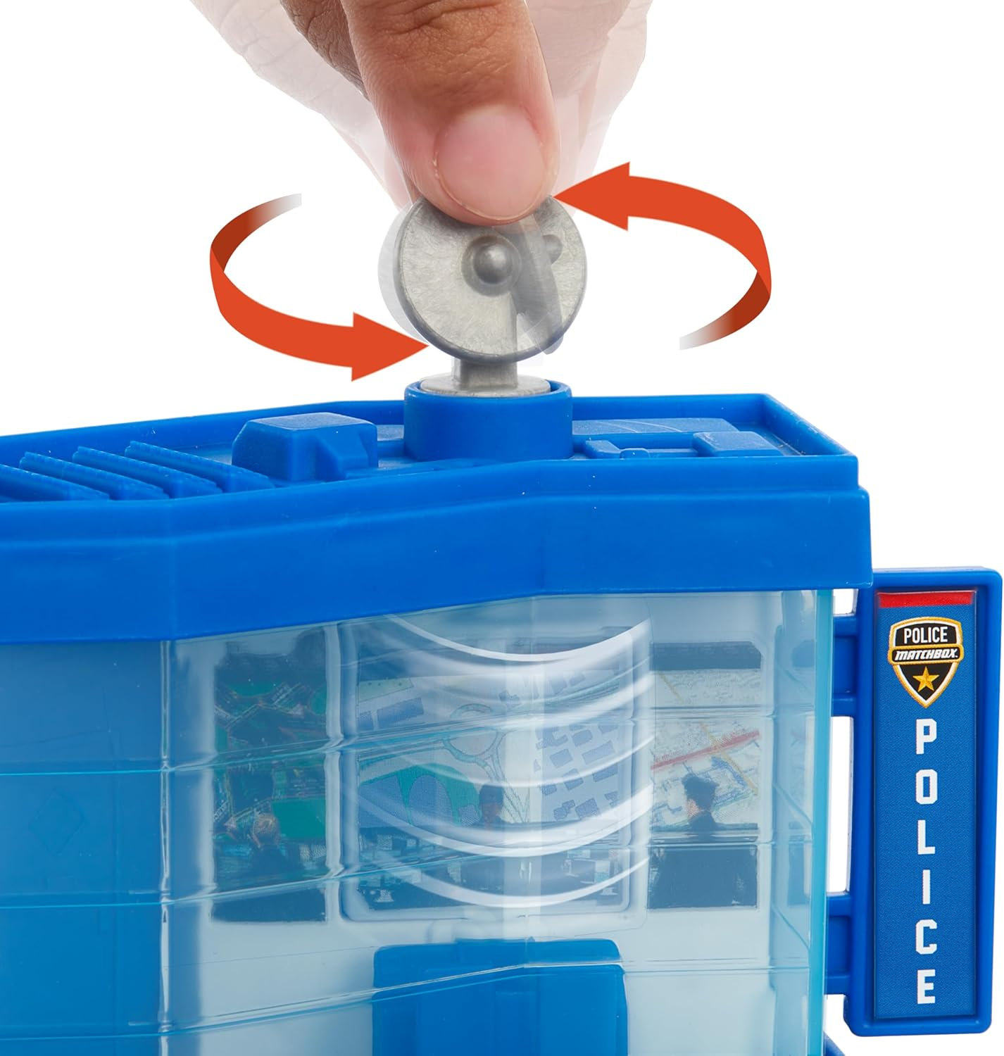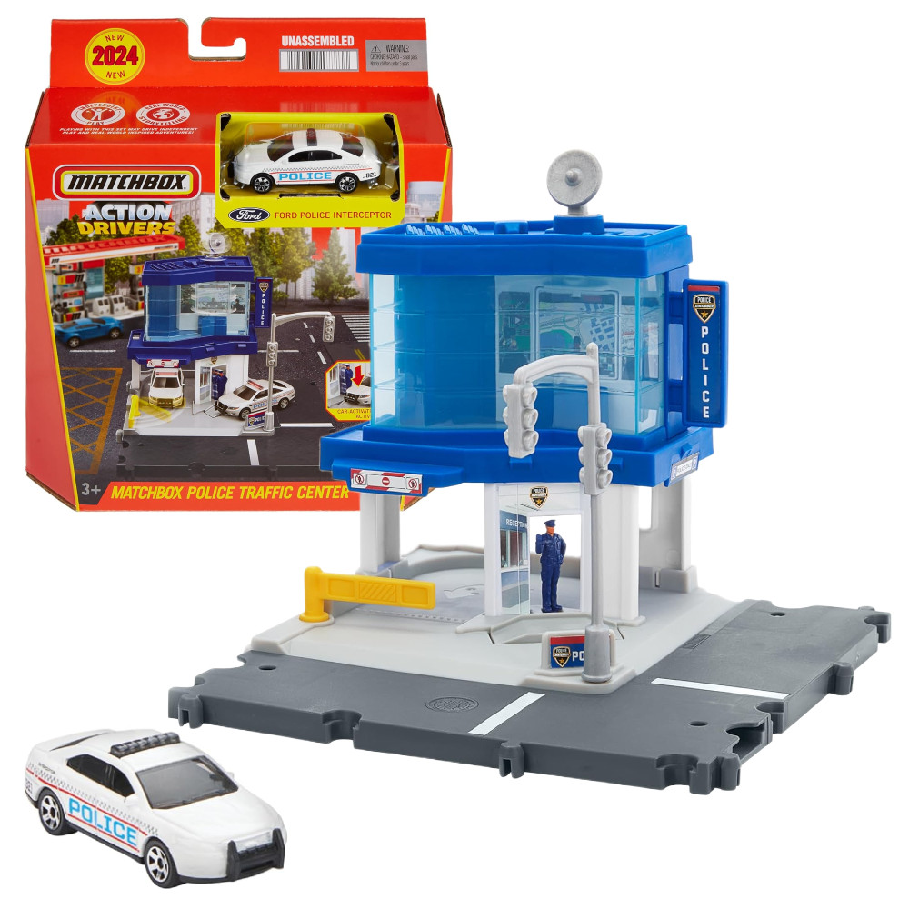 Wysyłaj wszystkie jednostki i chroń ulice dzięki zestawowi Matchbox Action Drivers Posterunek Policji. Podjedź na posterunek, aby uzyskać krótką informację od funkcjonariusza, który automatycznie wita pojazd, a następnie poczekaj na wiadomość z wieży kontrolnej z obrotowym satelitą, który aktualizuje sytuację na drogach. Gdy nadejdzie wezwanie, otwórz bramę i wyjedź.