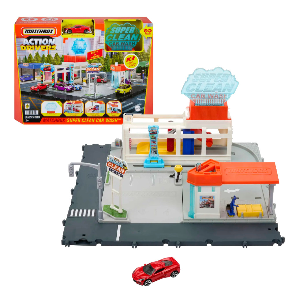 Zestaw Matchbox Prawdziwe Przygody Myjnia samochodowa pozwala dbać o auto i „wypucować” je na błysk! Wjedź do myjni, gdzie elementy takie jak wałki „czyszczą” samochody i przygotowują je do trasy. Podjedź na stanowisko „woskowania i polerowania”, a figurka pracownika automatycznie zacznie „pracować” nad wyglądem pojazdu, aby był jak nowy. Otwórz drzwi sklepu, aby wybrać „przekąski” na drogę i „zapłacić”, a potem „pozbądź się” okruszków za pomocą ruchomego węża do odkurzania. Światełka i dźwięki zestawu są niezwykle realistyczne, przywołując na myśl prawdziwą myjnię.