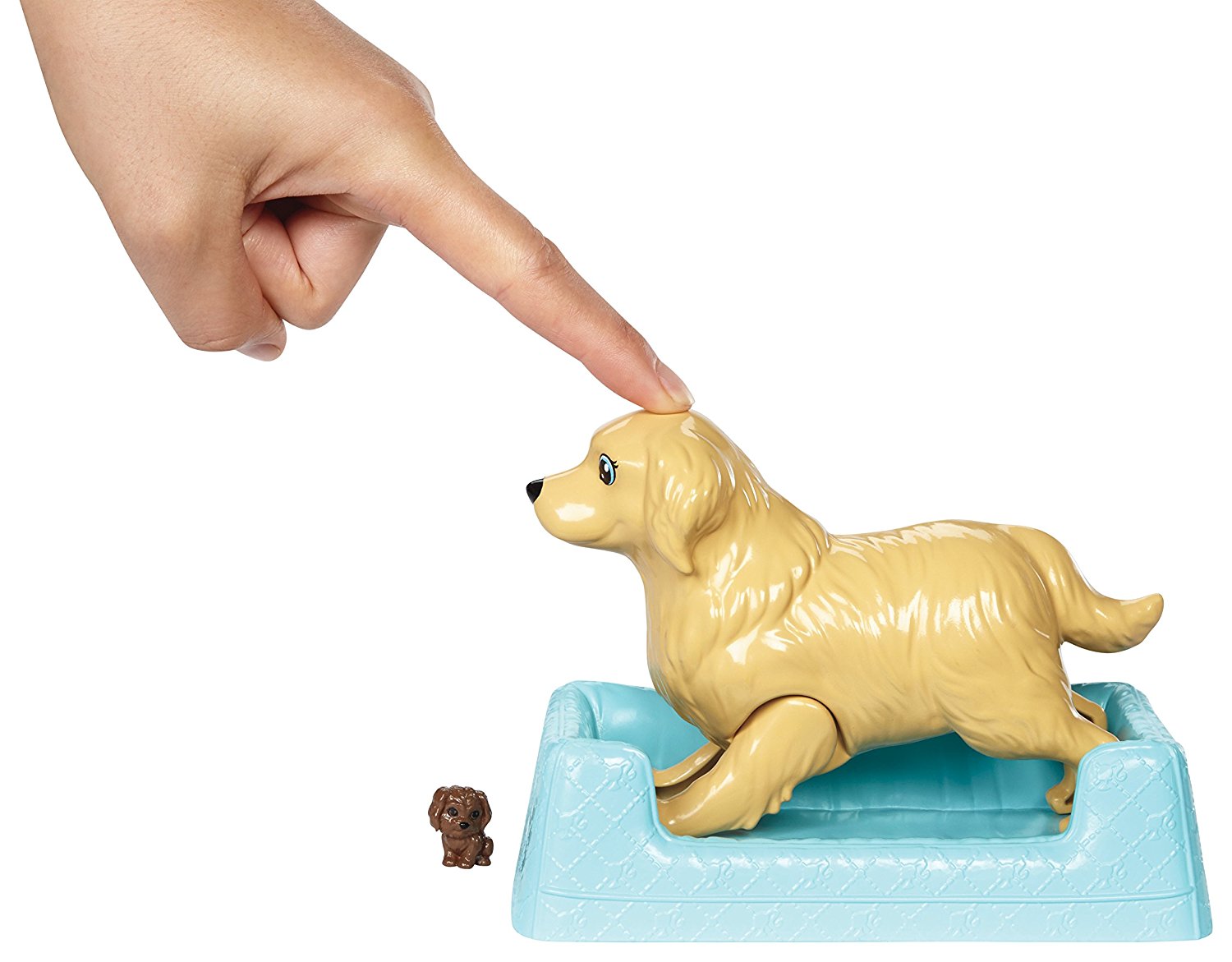 Niespodzianka! Jej ukochana sunia spodziewa się maluchów! Pomóż Barbie® przy narodzinach piesków, naciskając główkę psiej mamy. Naciśnij jeszcze dwa razy, aby na świat przyszły wszystkie maluchy!