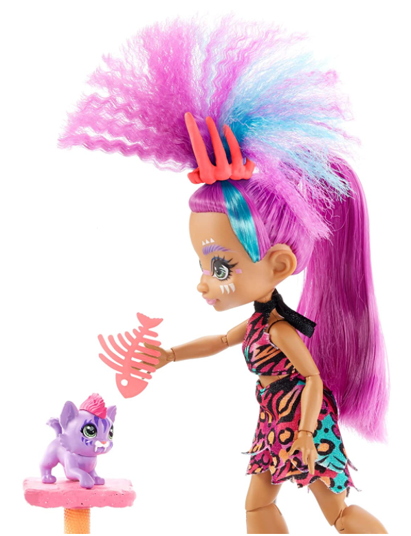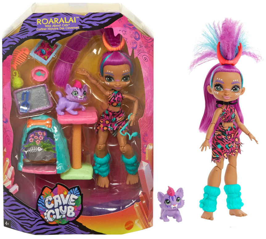 Cave Club to nowa seria z młodymi jaskiniowcami, która przeniesie Cię w zamierzchłe czasy, by przeżywać prehistoryczne przygody ze swoimi ulubionymi postaciami, takimi jak Roaralai. Zaopiekuj się wraz z Roaralai małą tygrysicą szablozębną Ferrell. Rozpieszcz ją, podając jej „przekąski” i zabawki. Legowisko i drapak sprawiają, że Ferrell poczuje się jak u siebie. W zestawie znajdują się wszytskie niezbędne kocie akcesoria takie jak: „kuweta”, szufelka, miseczka i zabawki. Lalka Roaralai jest ubrana w neonowy strój o zwierzęcym wzorze, a fioletowe włosy ma ułożone w szaloną fryzurę.