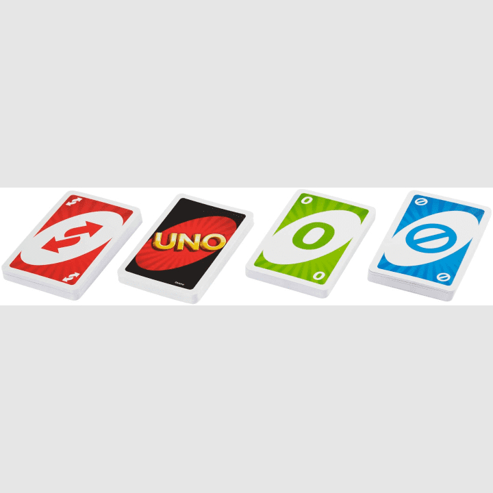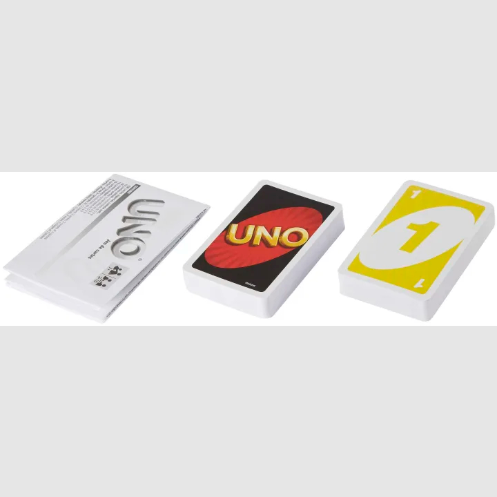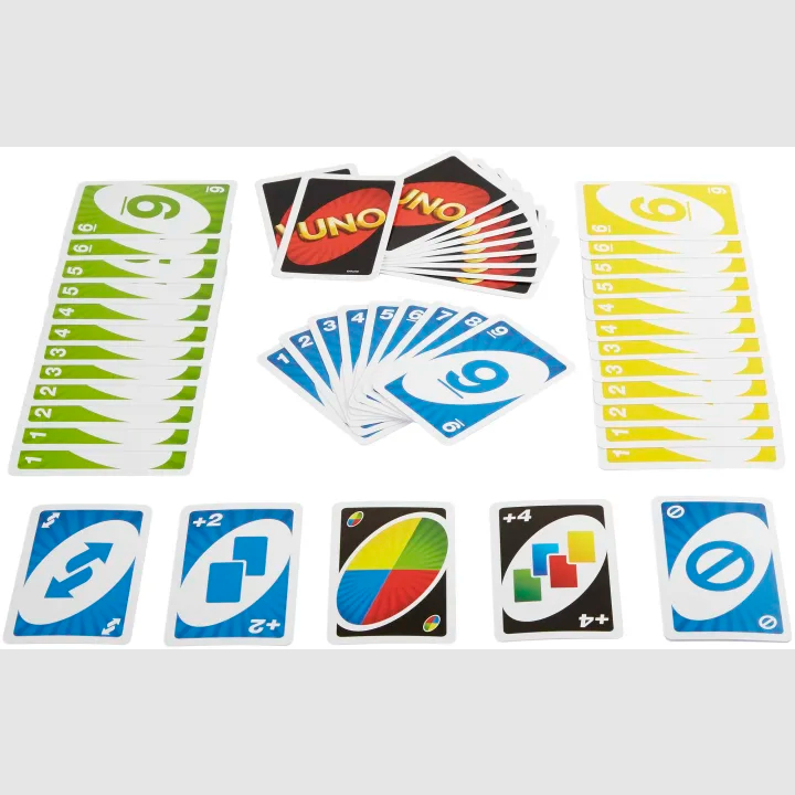 W zestawie znajdziesz 19 kart każdego koloru (czerwony, zielony, niebieski i żółty), a także 8 kart „Dobierz dwie”, „Odwróć” i „Pomiń” w każdym kolorze, wraz z 4 kartami „Dzikie”, 4 kartami „Dzikie – Dobierz cztery”, 1 kartą „Dzikie – Zamień ręce” i 3 kartami „Dzikie – Konfigurowalne”