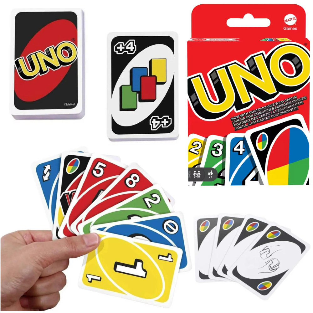 UNO™ – klasyczna gra karciana polegająca na dopasowywaniu kolorów i liczb, którą łatwo opanować… a od której nie można się oderwać – teraz z personalizowanymi kartami „Wild” dla jeszcze większej frajdy! Gracze na zmianę starają się pozbyć wszystkich swoich kart, dopasowując kartę z ręki do aktualnej karty leżącej na wierzchu talii. Specjalne karty akcji zapewniają momenty zmieniające przebieg gry i pomagają pokonać przeciwników! Użyj karty „Zamień ręce”, aby zamienić się rękami z dowolnym przeciwnikiem, i wykorzystaj 3 konfigurowalne (i wymazywane) karty dzikie, aby stworzyć własne zasady!