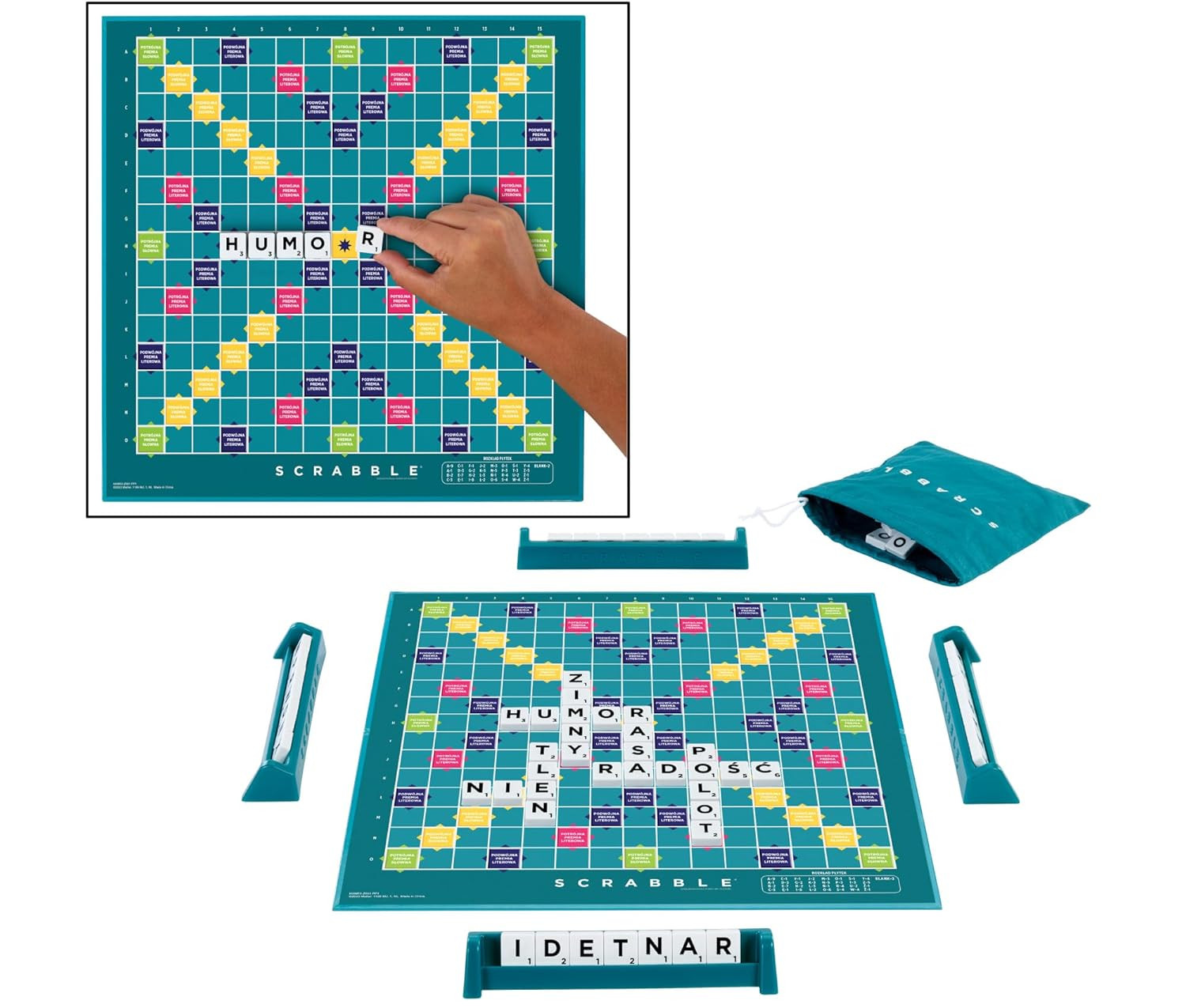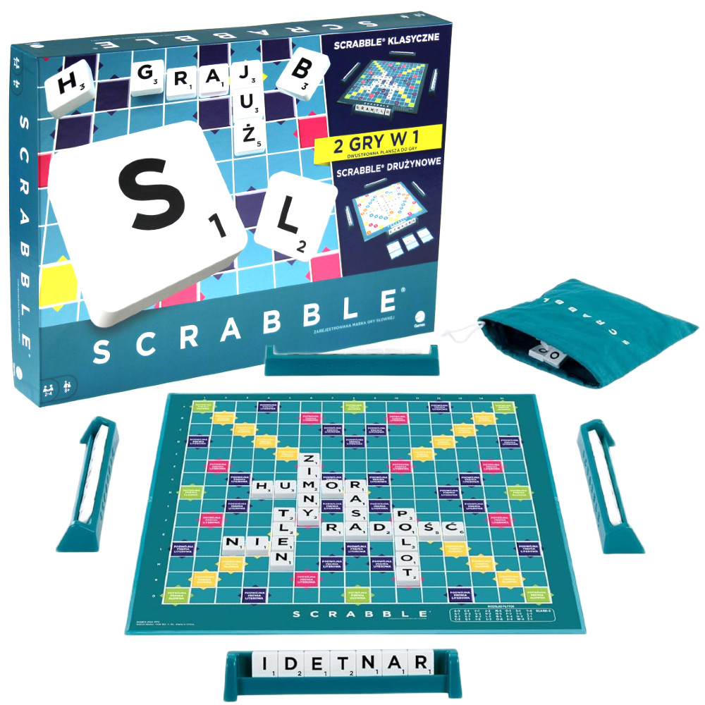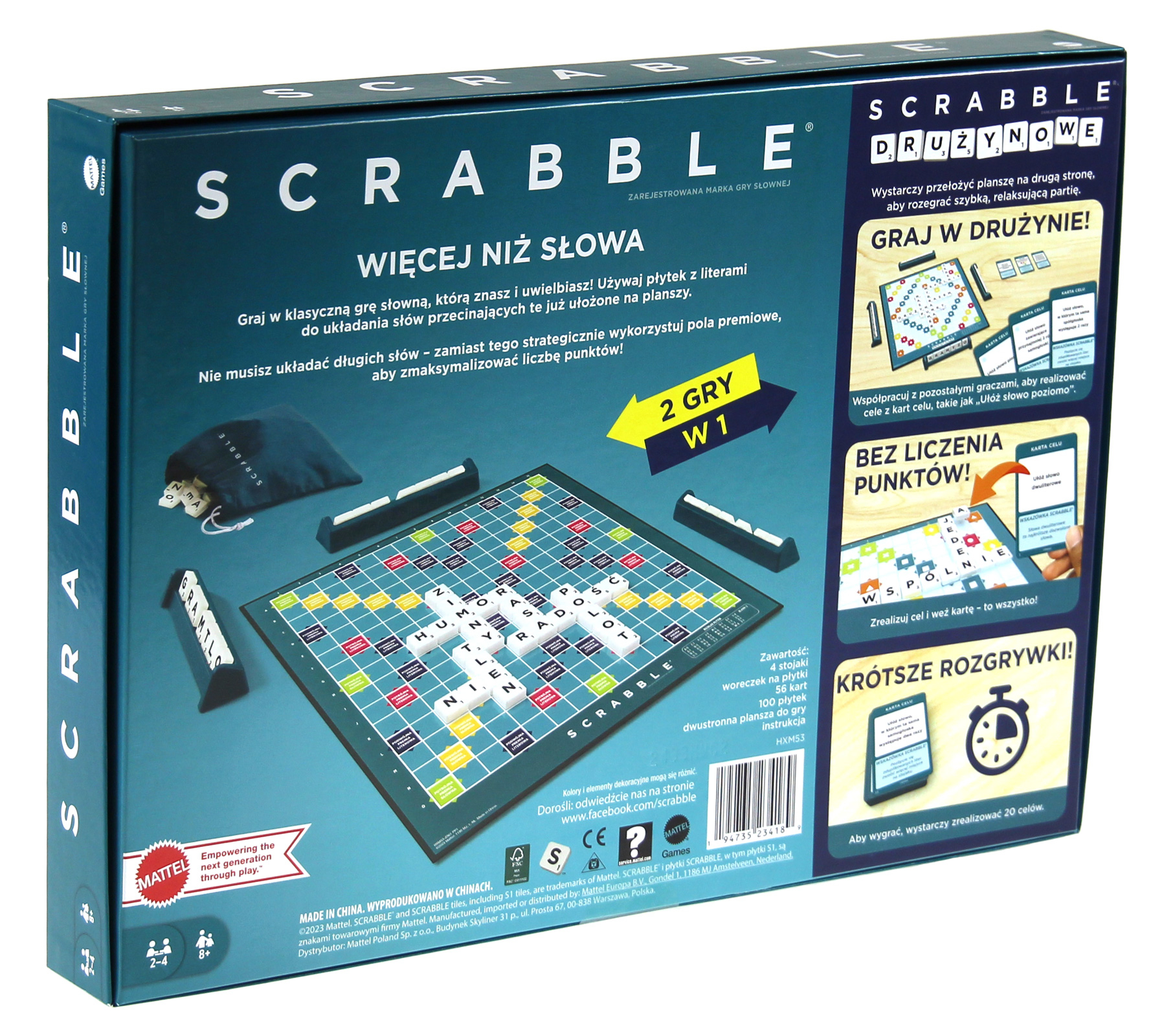 Dwie gry w jednej! Postaw na klasyczną rozgrywkę Scrabble, którą znasz i uwielbiasz…lub przekręć dwustronną planszę i spróbuj odmiany Scrabble Drużynowe dostosowanej do szybszej, bardziej relaksującej rozgrywki, gdzie gracze współpracują, a liczenie punktów jest łatwiejsze.