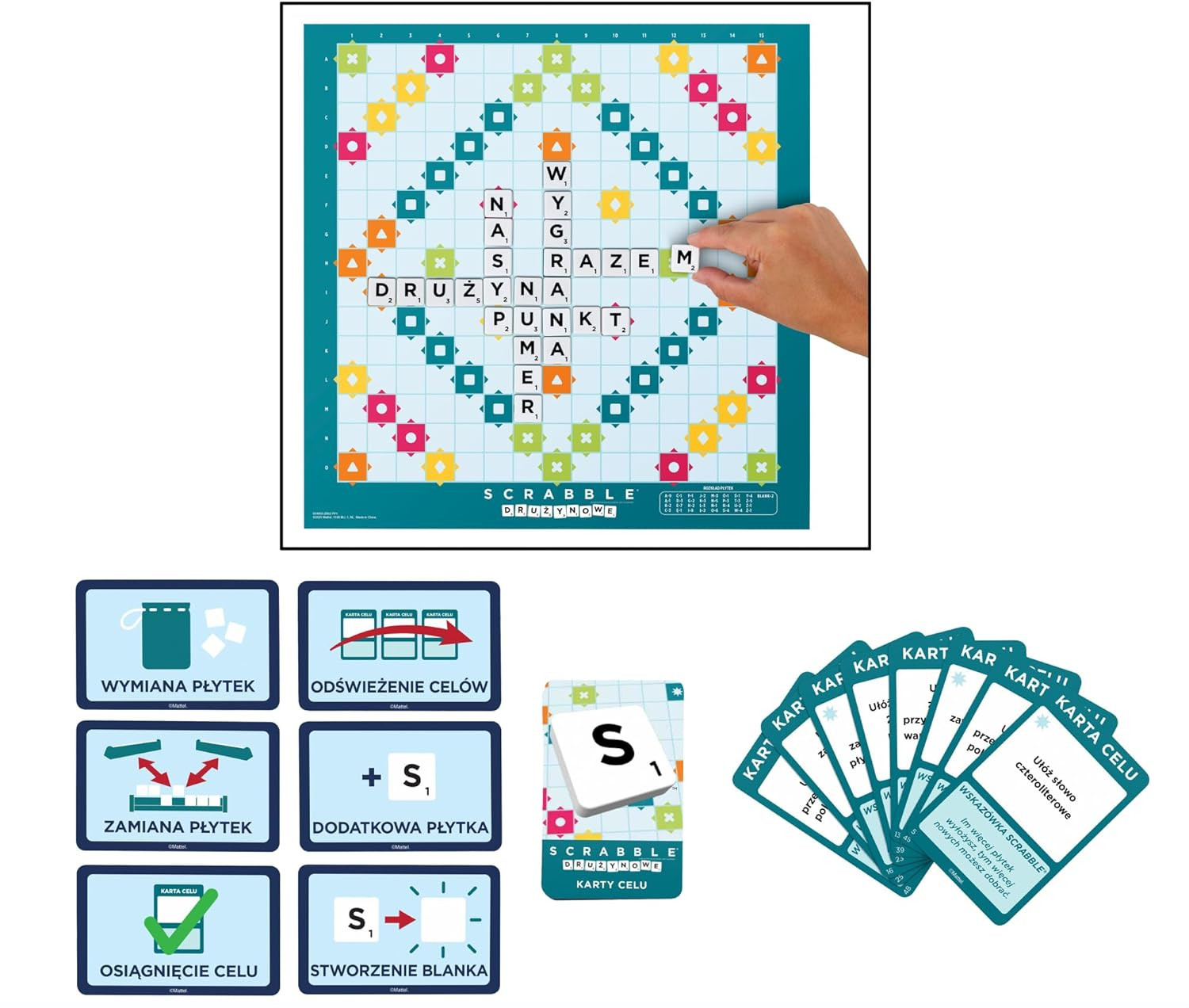 W grze Scrabble Drużynowe działacie jako zespół, by wspólnie ukończyć wyzwania na 50 kartach z celami, które uczą podstaw gry w Scrabble. Wyciągnij kartę i odkryjcie wyzwanie takie jak „Ułóż słowo pięcioliterowe”. Wykonajcie zadanie i weźcie kartę, aby zyskać punkt – liczenie punktów jest takie proste!