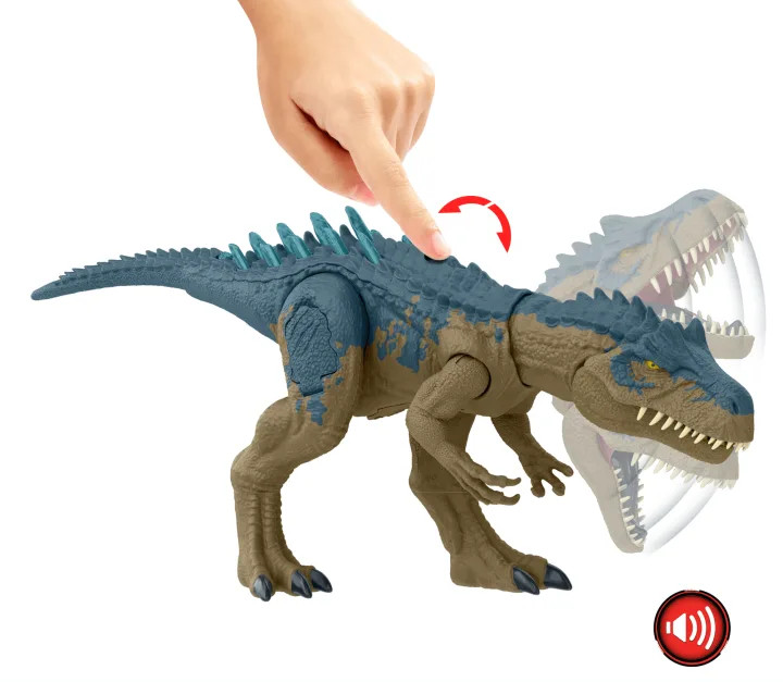 Allozaur Straszny Atak zwiastuje epicką ewolucję w świecie figurek Jurassic World. Element obrotowy na grzbiecie dinozaura aktywuje płynny realistyczny ruch – dziki atak paszczą podkreślany rykiem. Ten dinozaur jest gotowy do walki – wystarczy nacisnąć przycisk na ogonie, aby uniosły się kolce na ogonie i grzbiecie. Zachwyć się pełną szczegółów teksturą tej figurki nawiązującymi do tropikalnego otoczenia. Wystarczy zeskanować kod tropiący w bezpłatnej aplikacji Jurassic World Play za pomocą kompatybilnego smartfona/tabletu (z Androidem lub iOS, nie znajduje się w zestawie), aby odkryć funkcje i gry w rzeczywistości rozszerzonej.