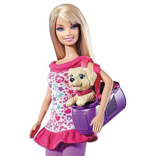 Barbie wyrusza na spacer ze swoimi pieskami. Szczeniaczek jedzie na wózku, a suczka Taffy idzie obok na smyczy. Suczka może ciągnąć wózek ze szczeniaczkiem. Nosidełko dla szczeniaczka można odłączyć od wózka i bawić się, nosząc je.